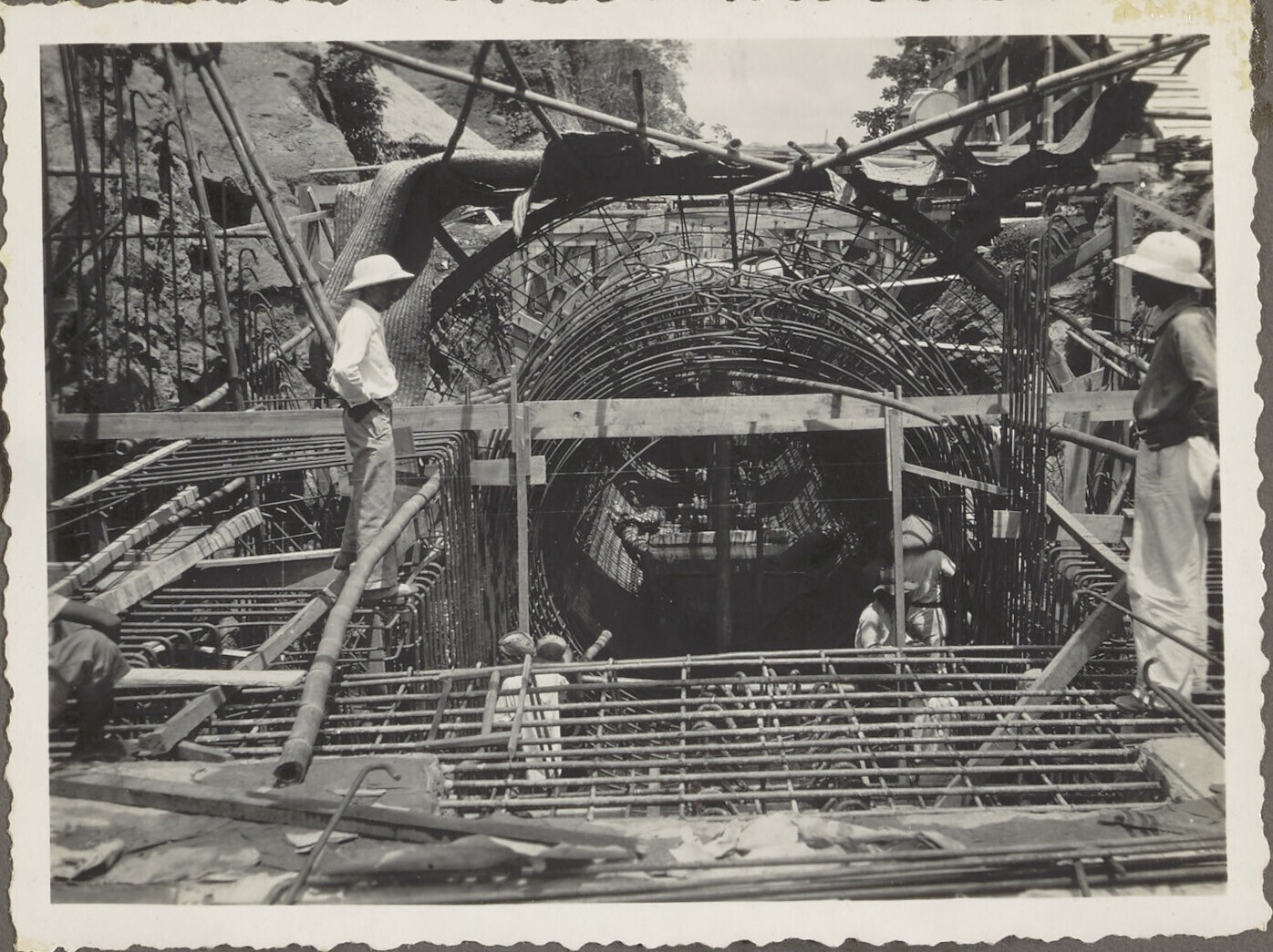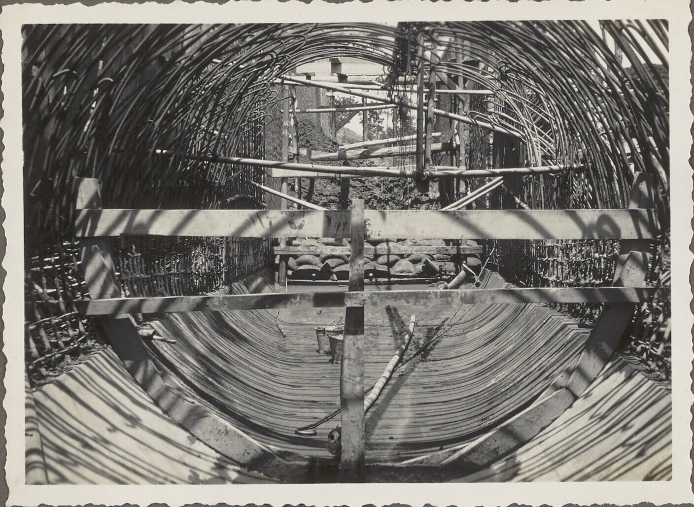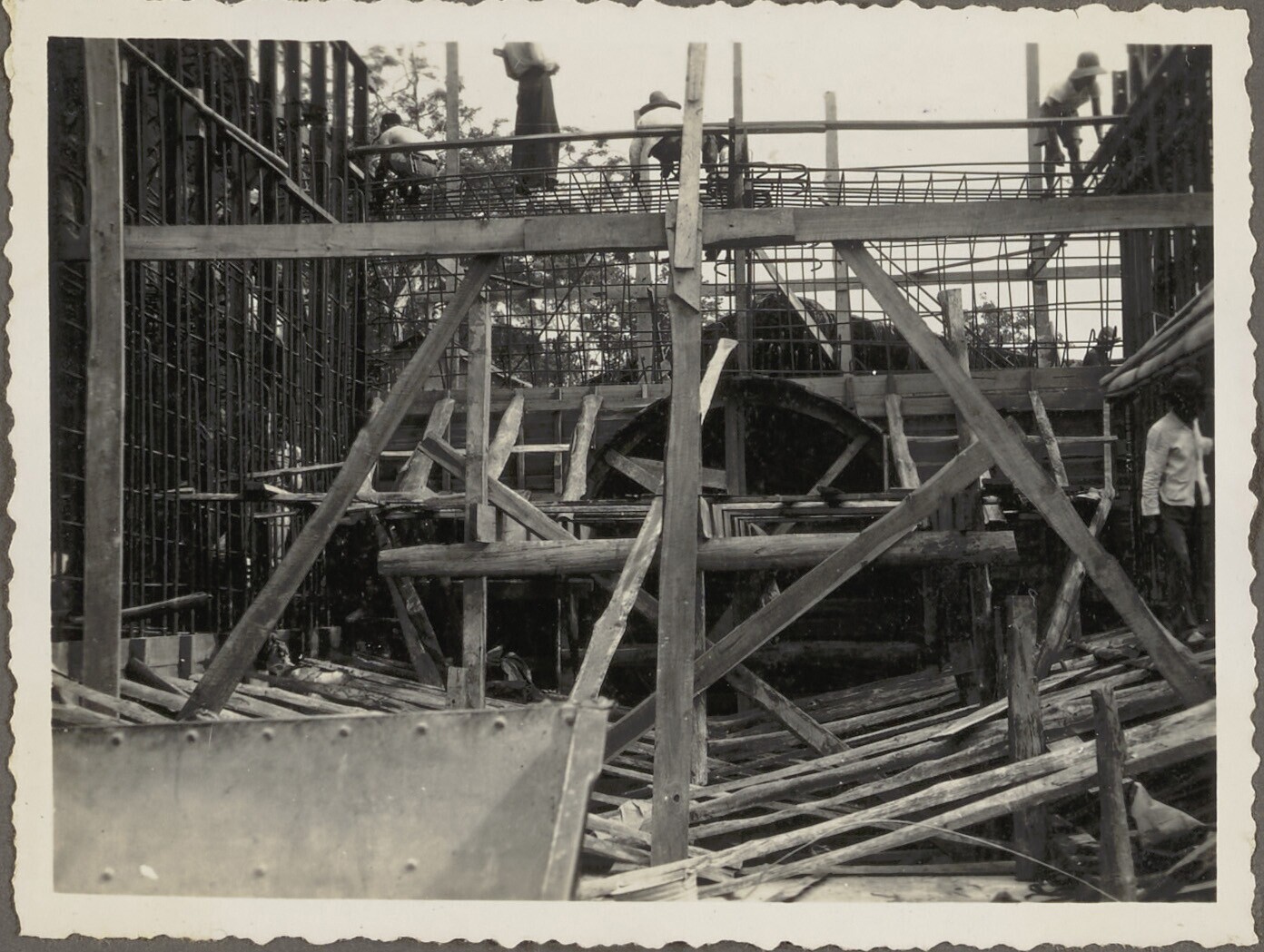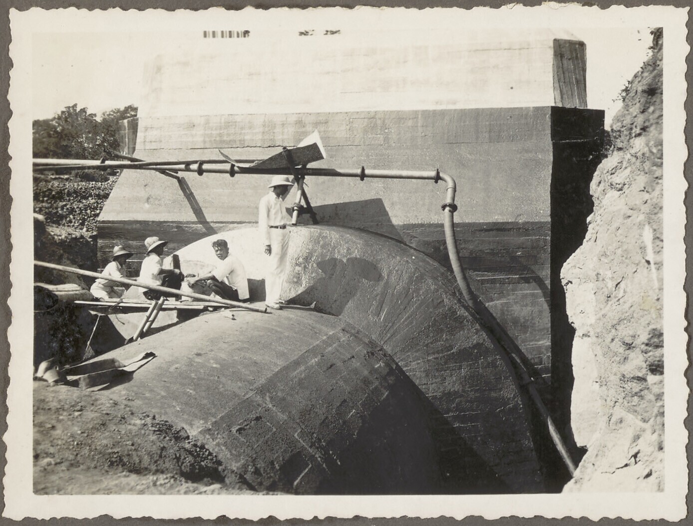 Bouw van een buis met woelbak door Javaanse arbeiders