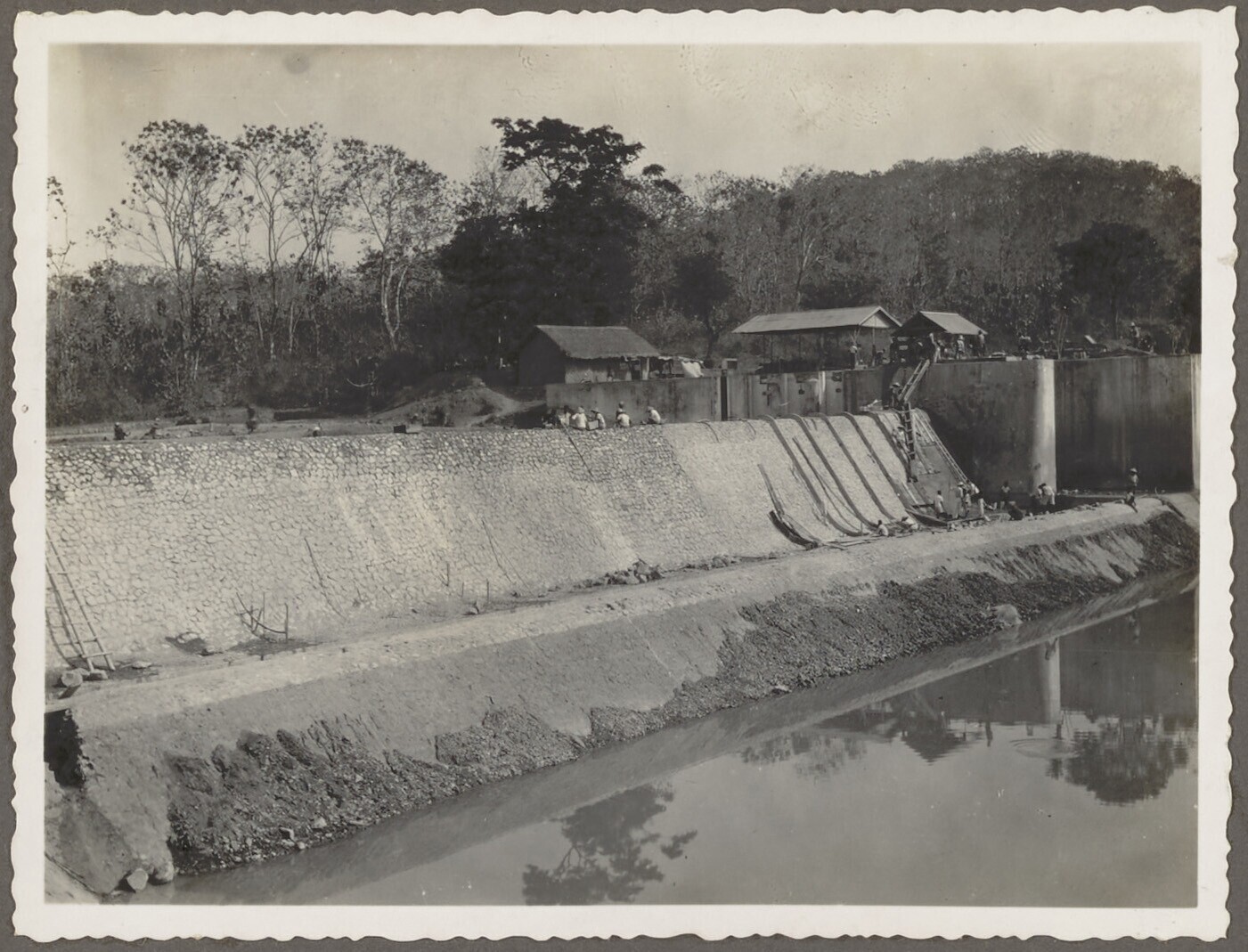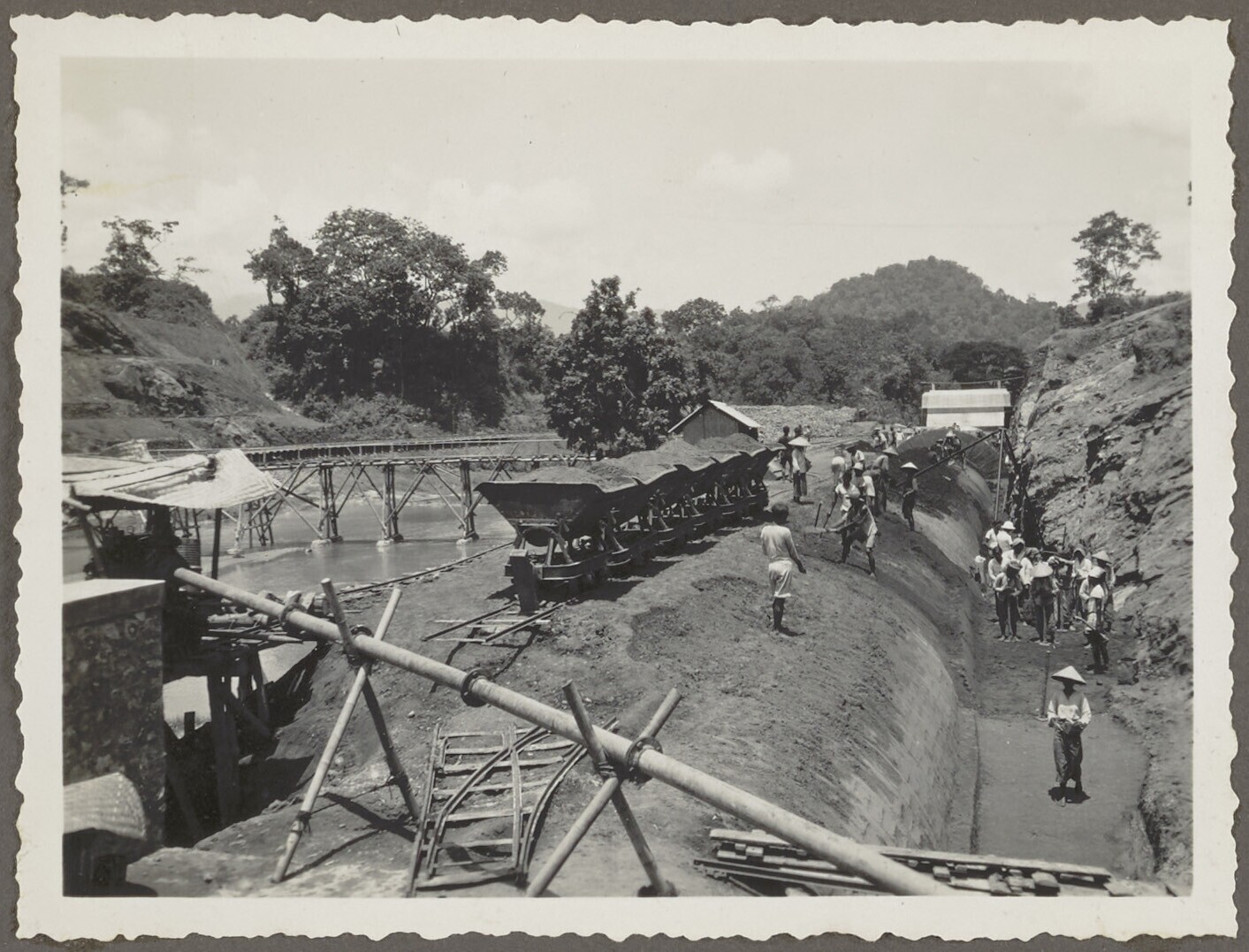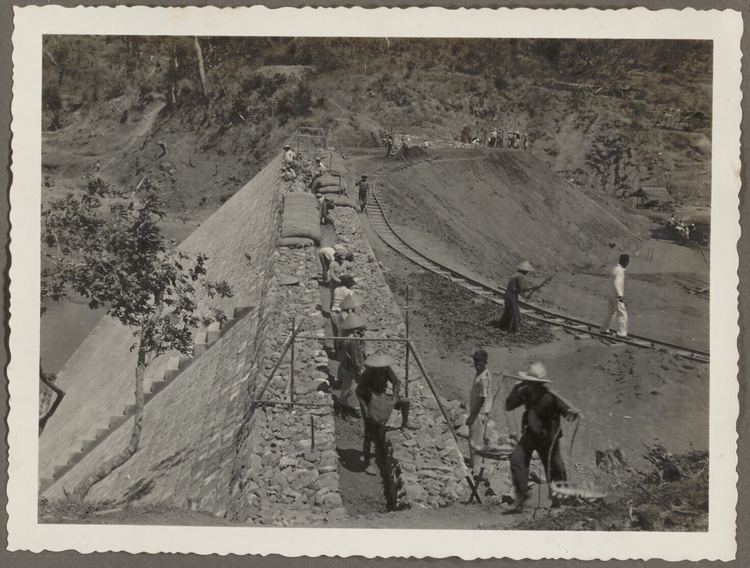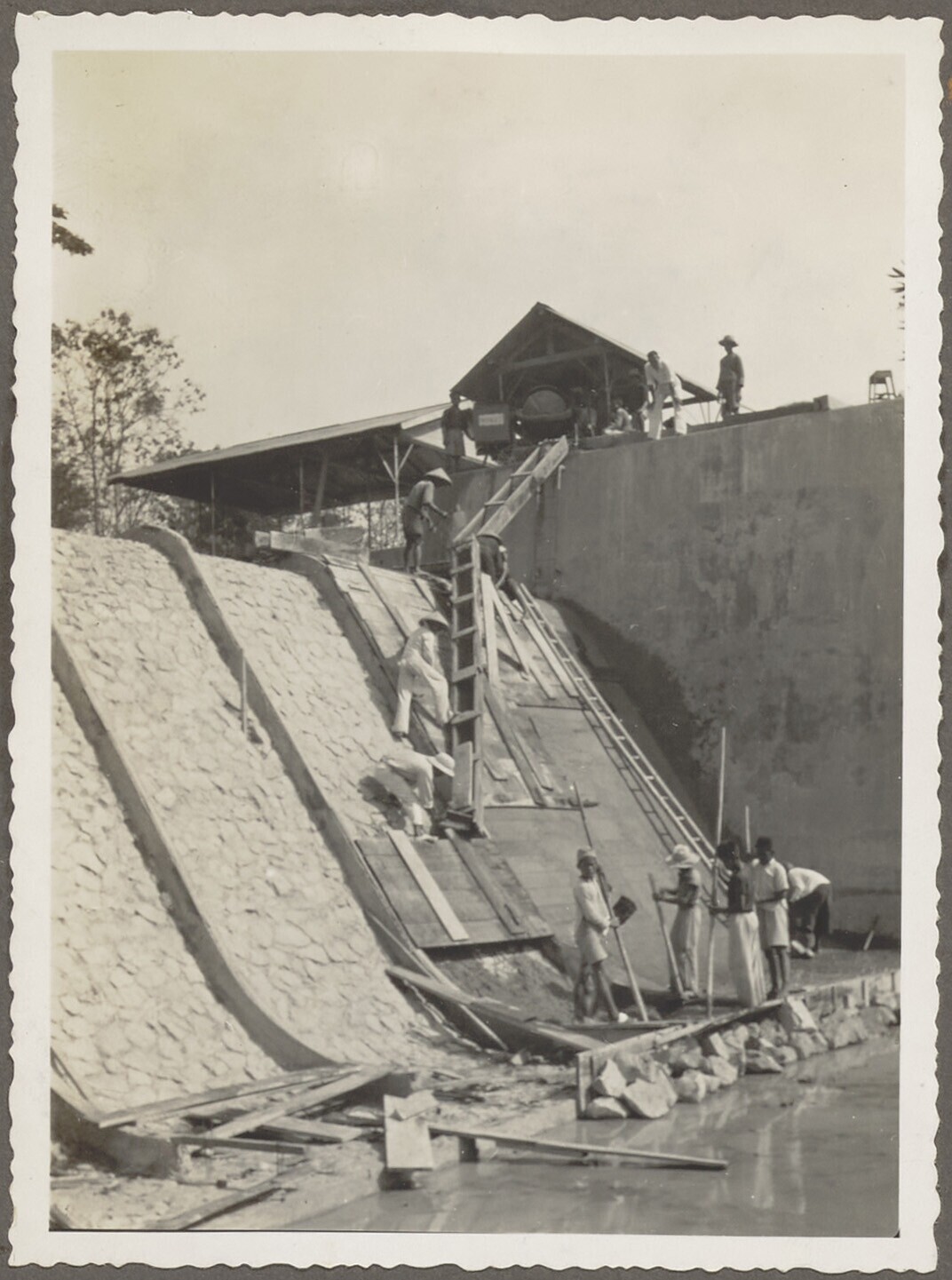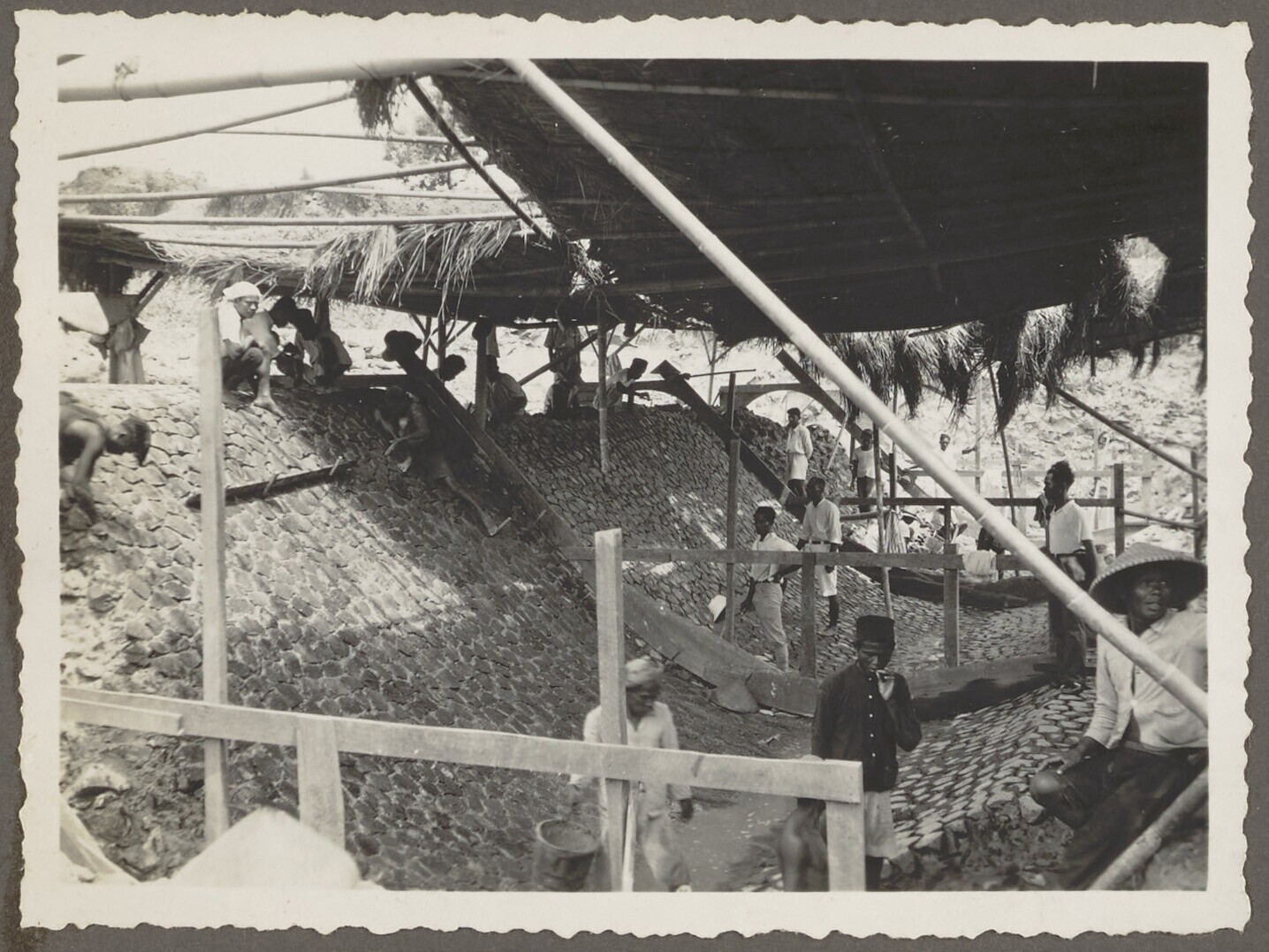 Javaanse arbeiders op de bouwplaats van een waterdis...