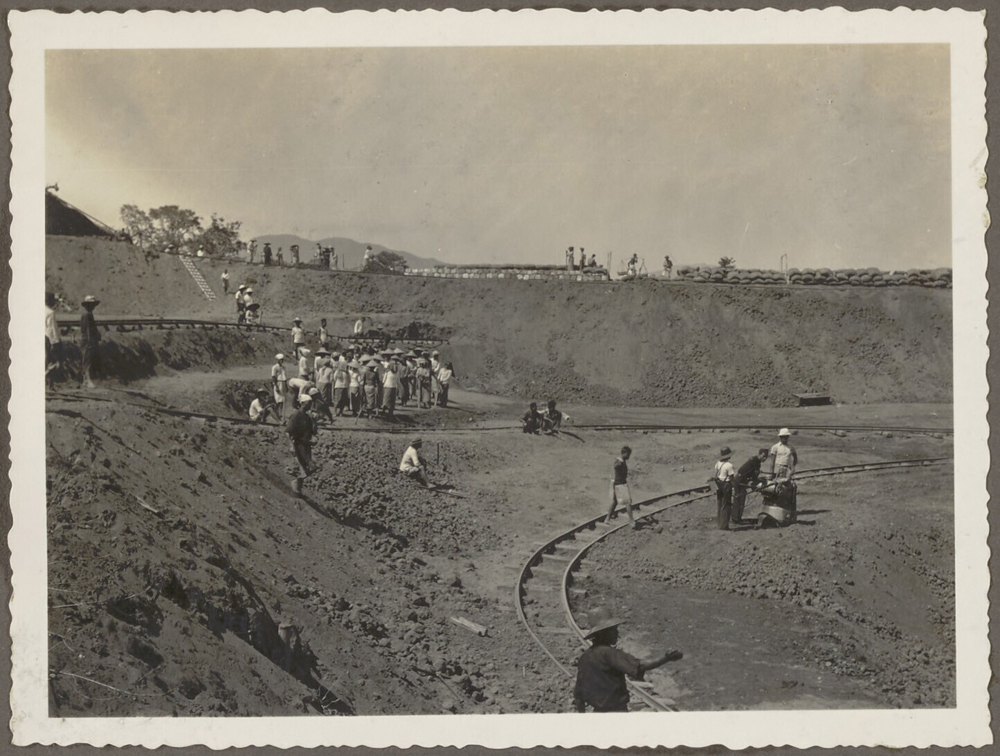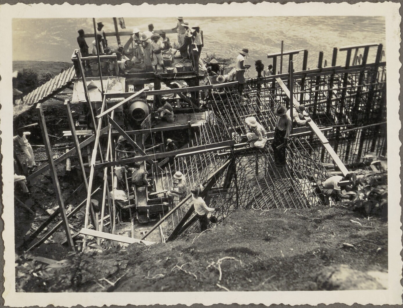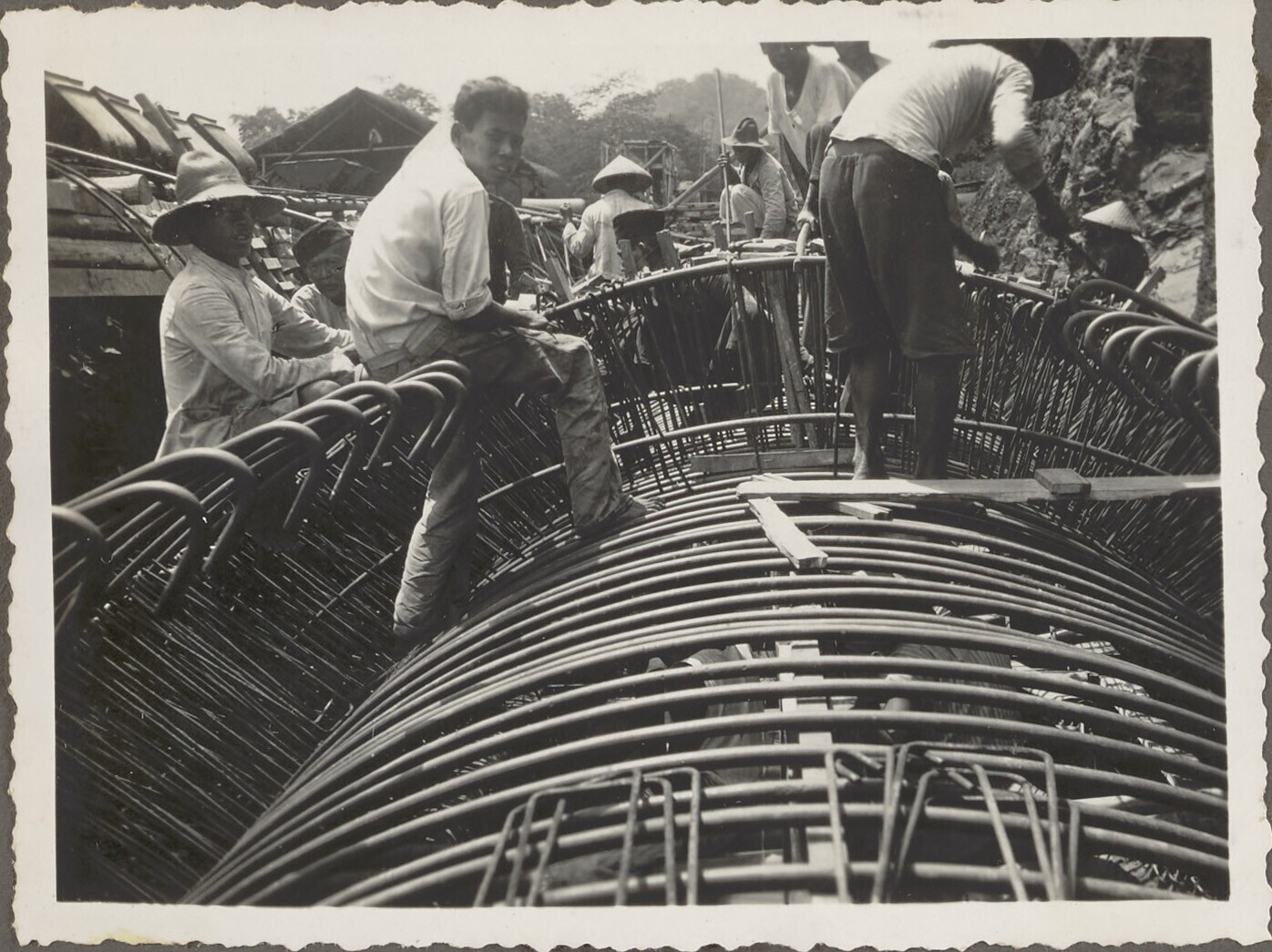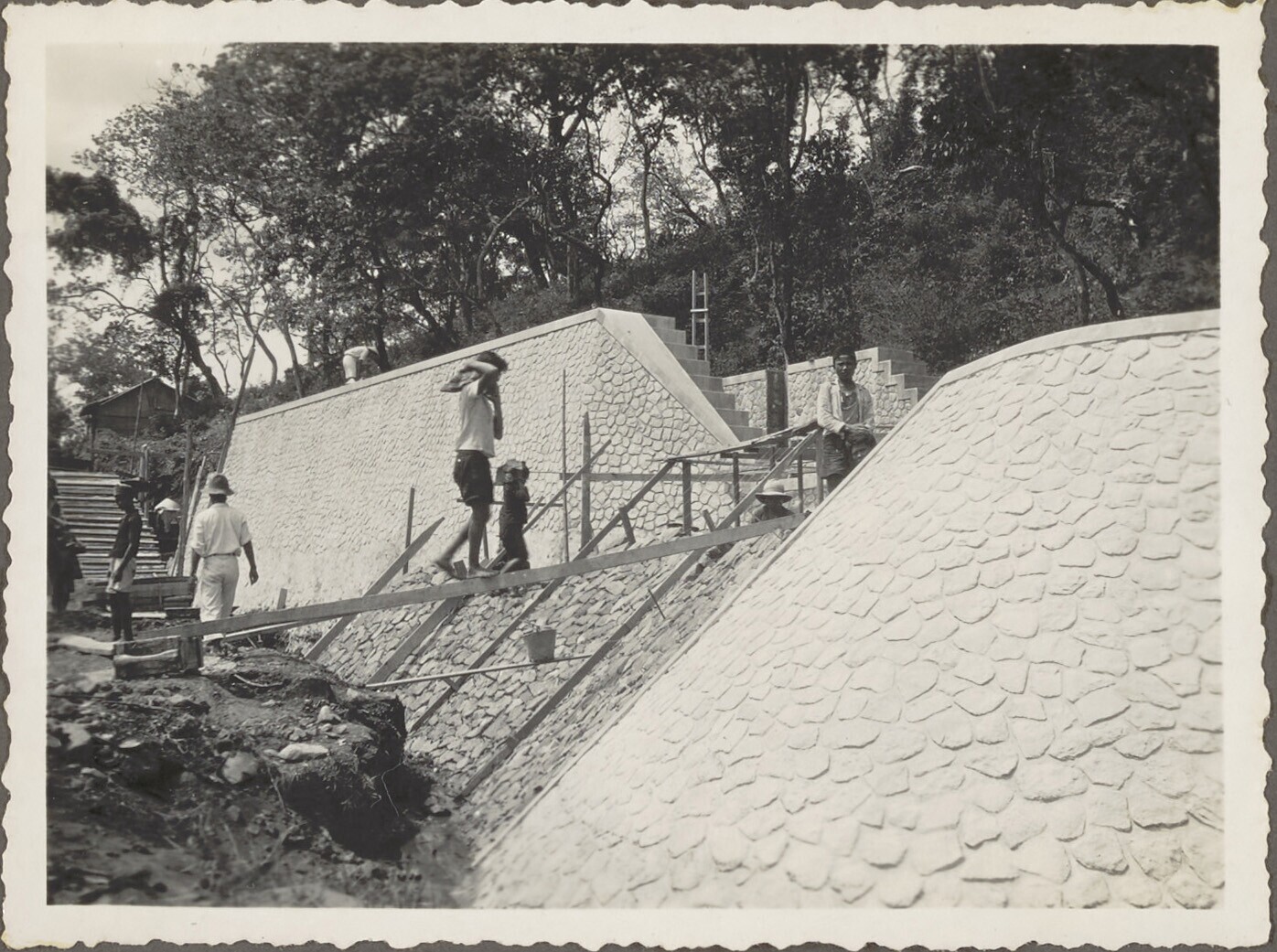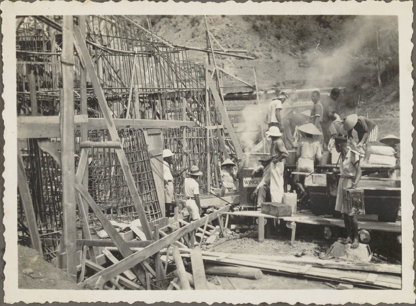 Javaanse arbeiders op de bouwplaats van een waterdis...