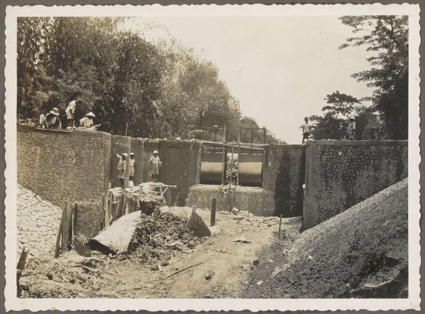 Javaanse arbeiders aan het werk bij de verdeelsluis ...