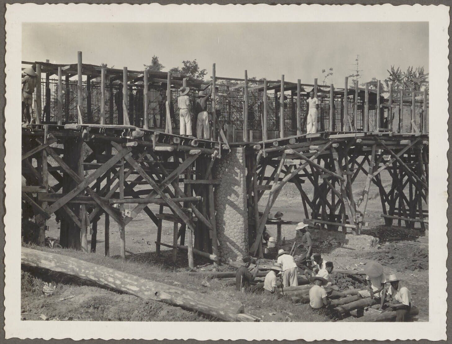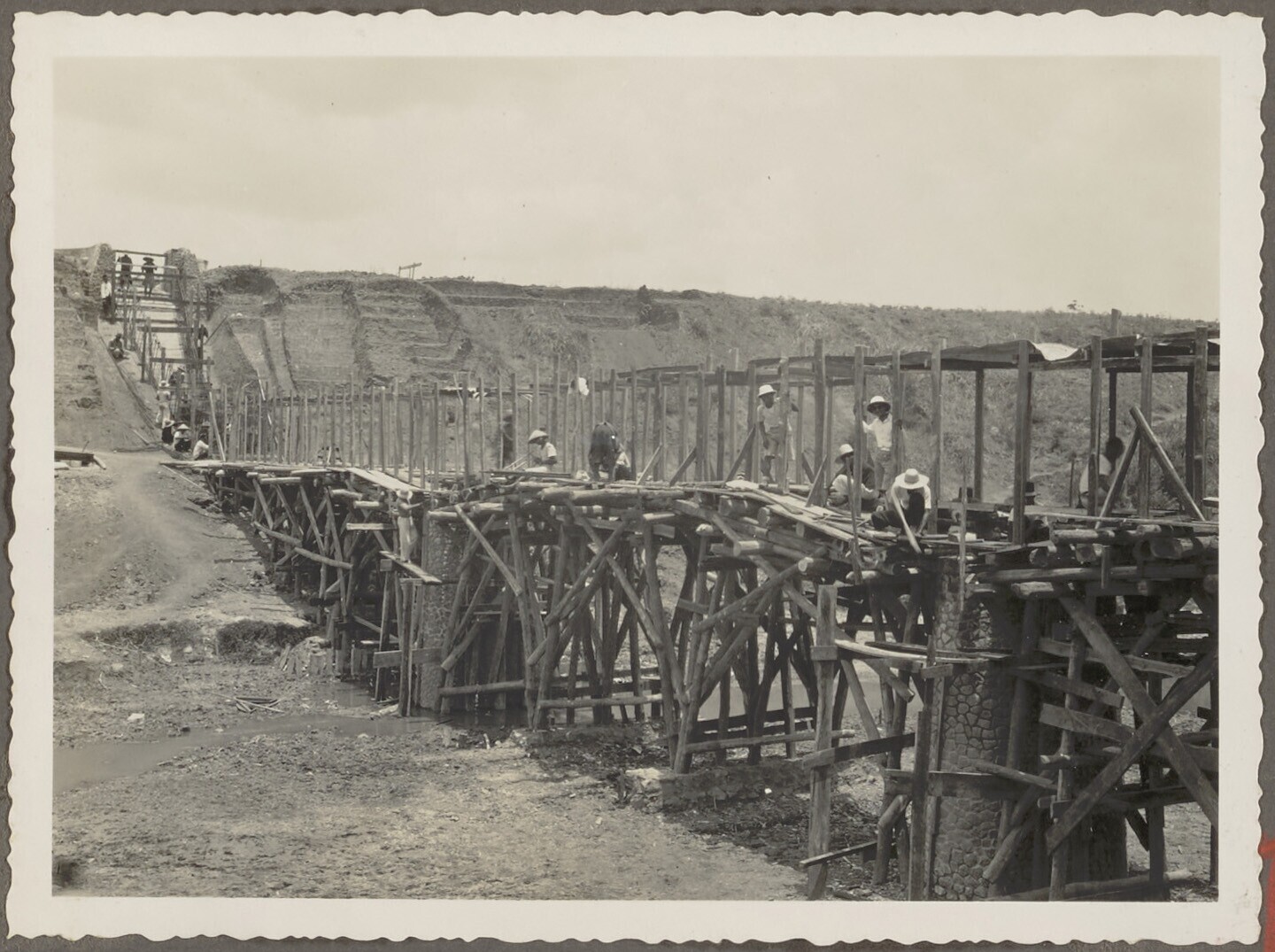 Javaanse arbeiders aan het werk bij de werkbrug over...