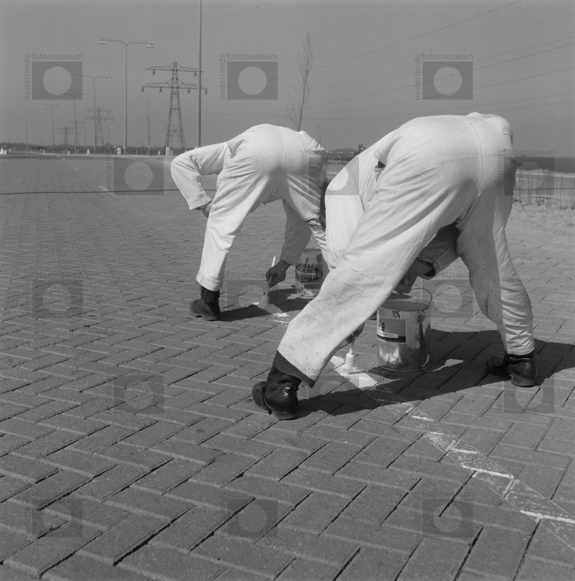 Wegwerkers schilderen witte markering op wegdek Zuid...