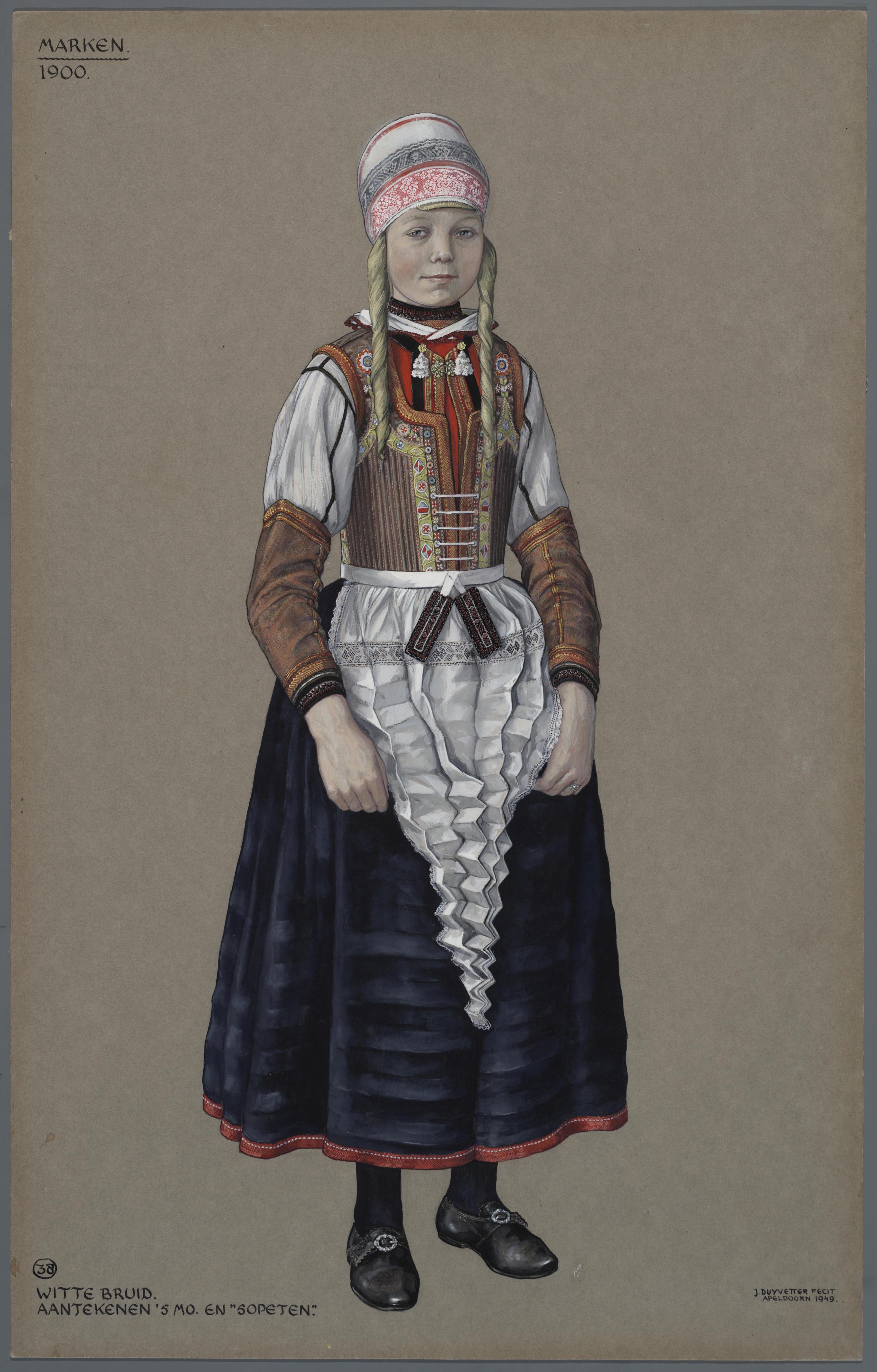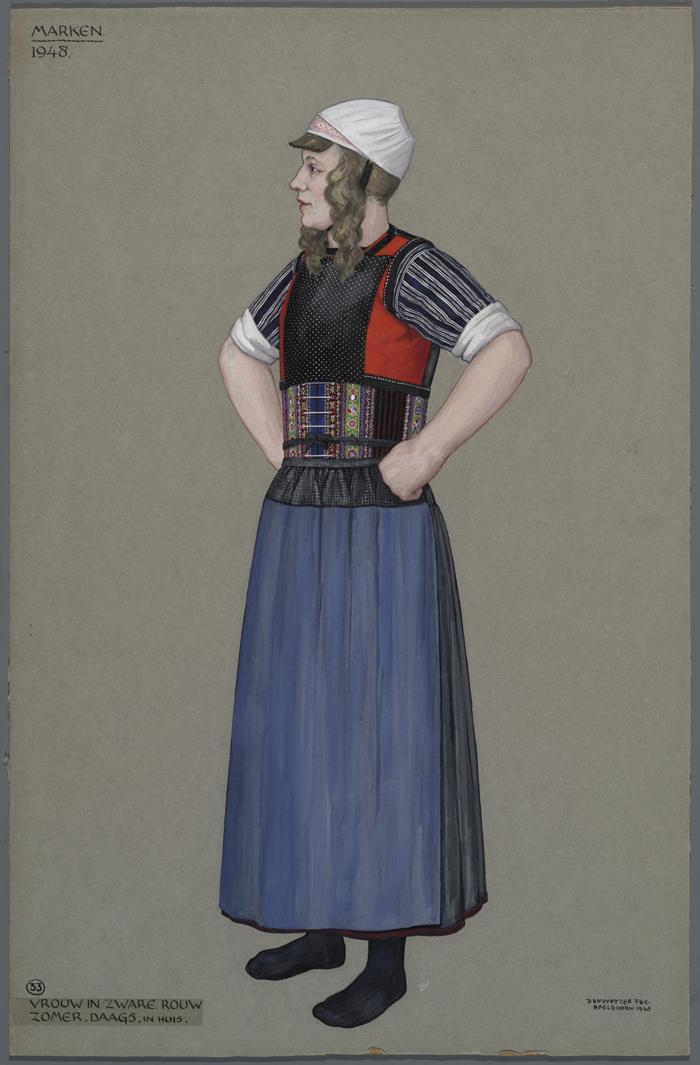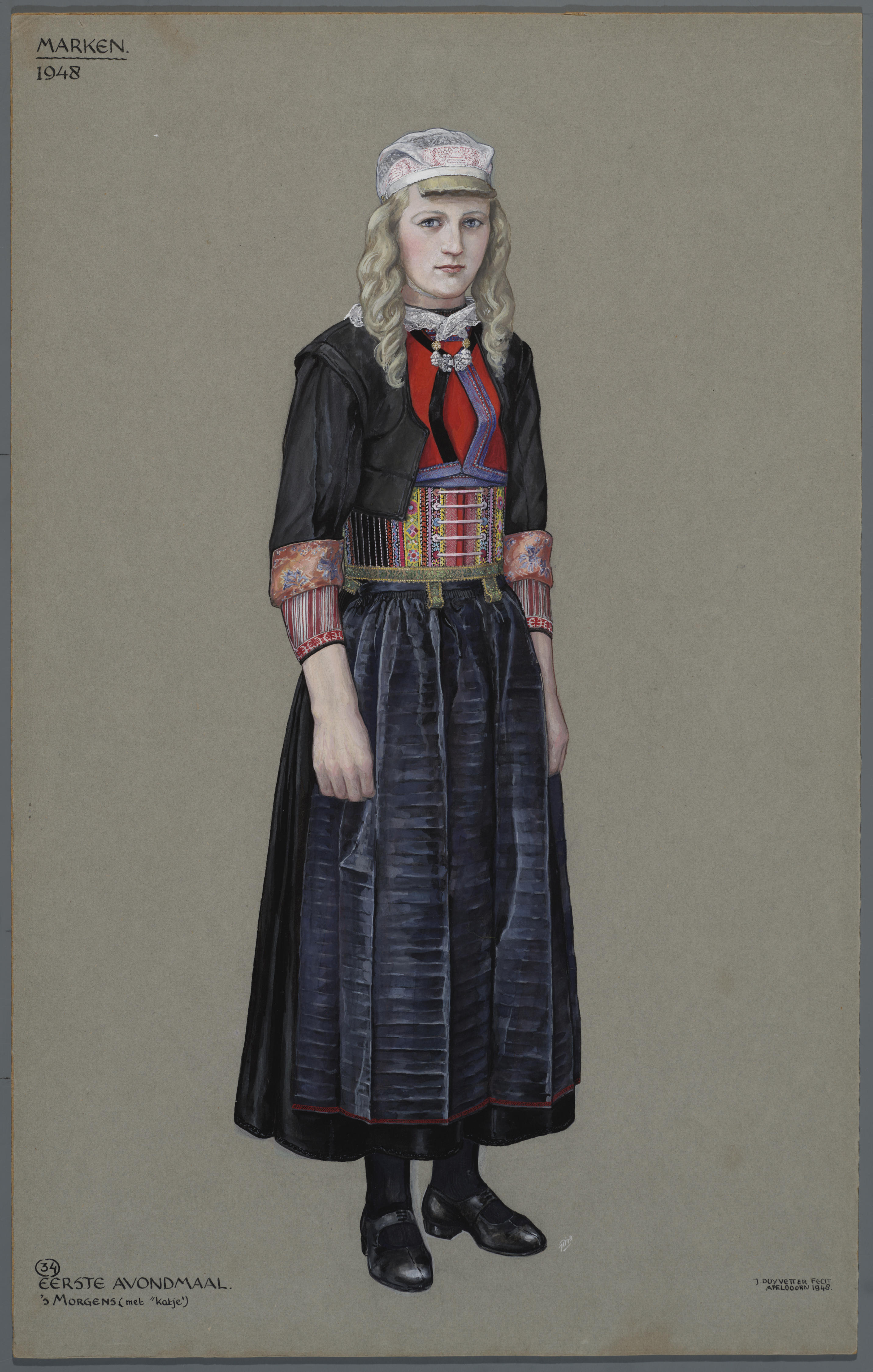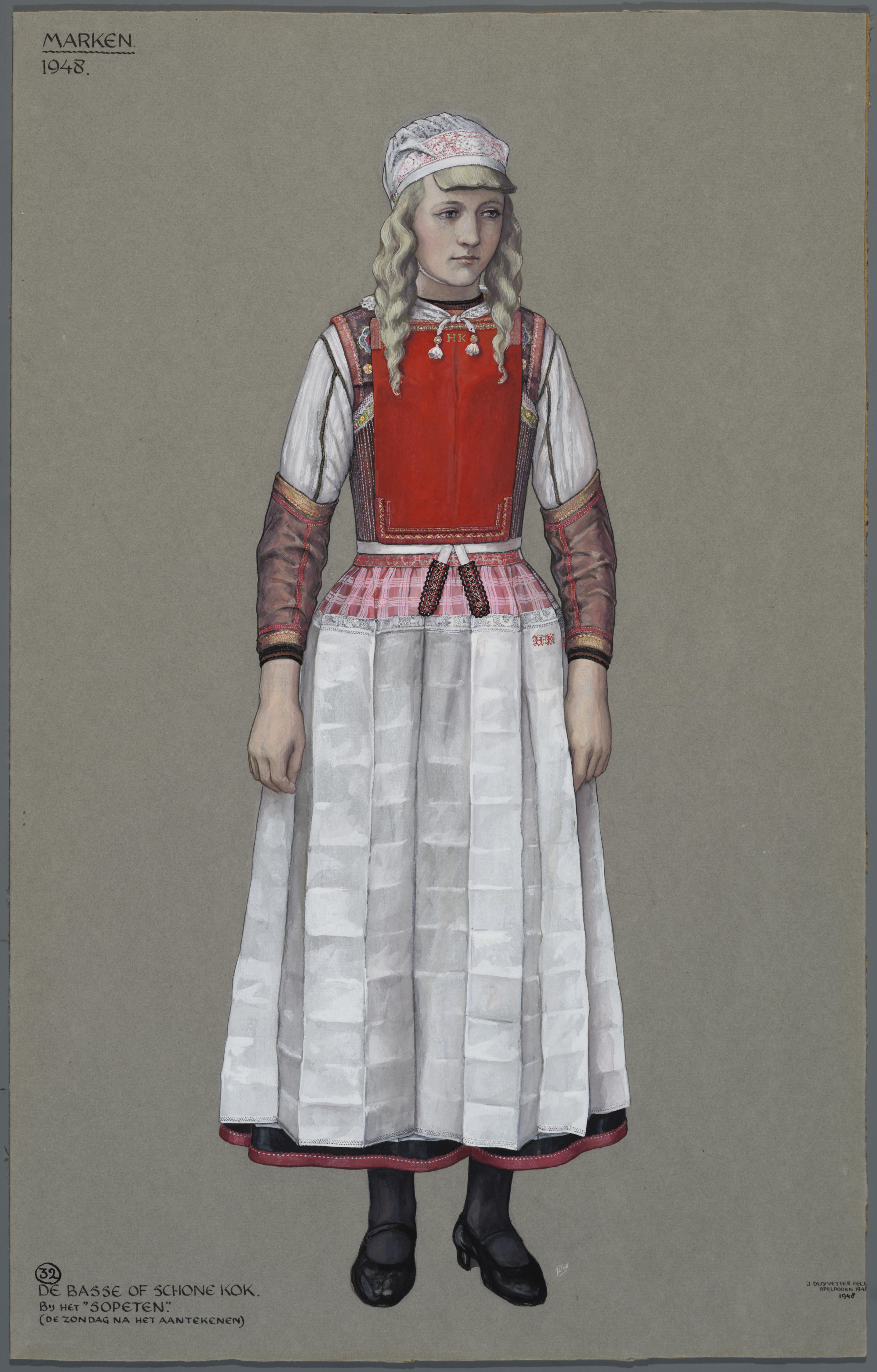 Vrouw in dracht van de basse of schone kok, Marken, ...