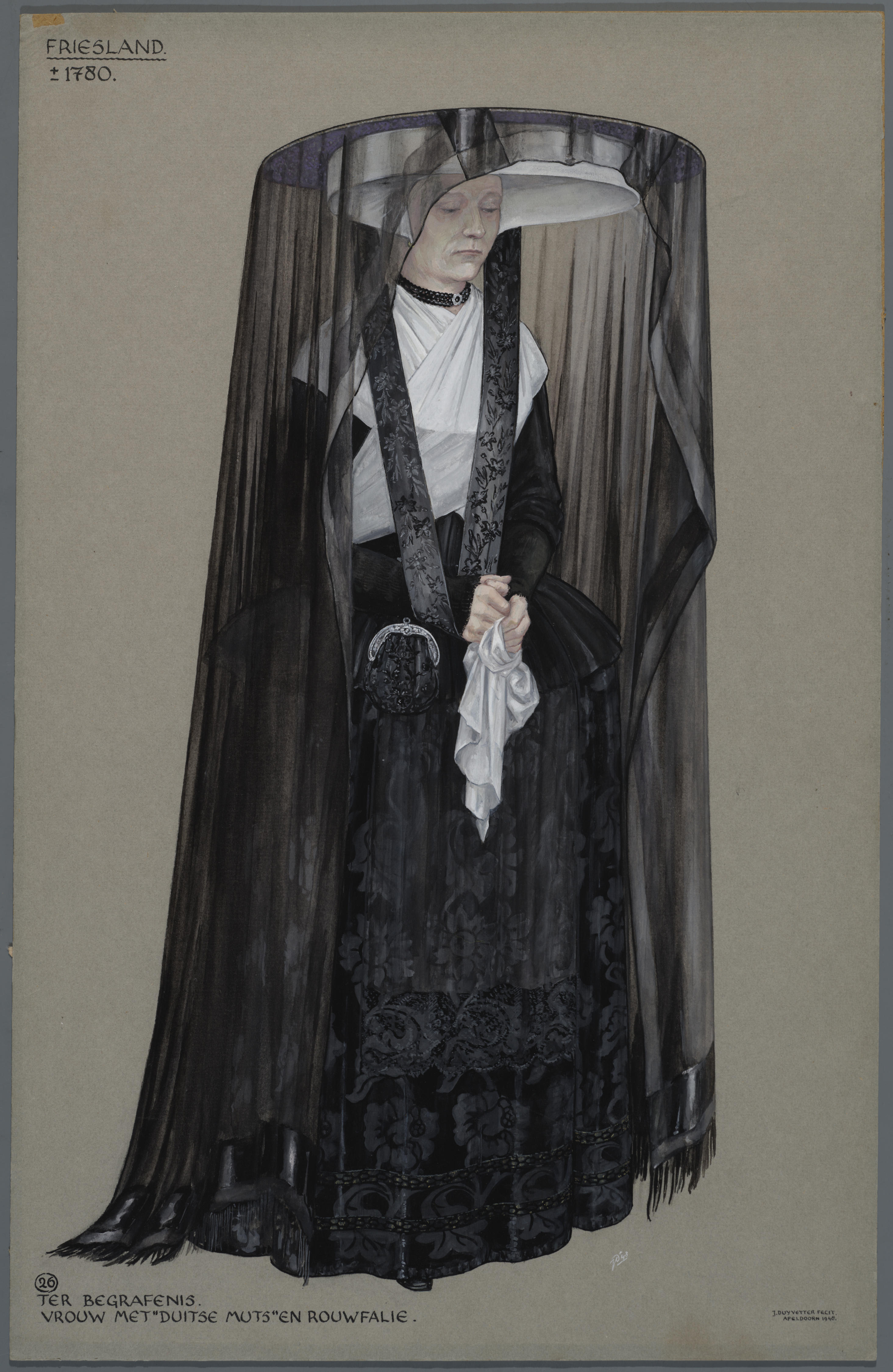 Friesland circa 1780. Ter begrafenis. Vrouw met `Dui...