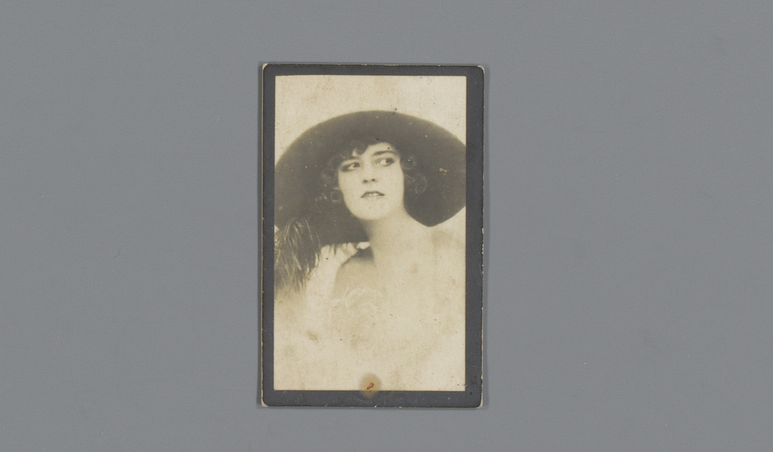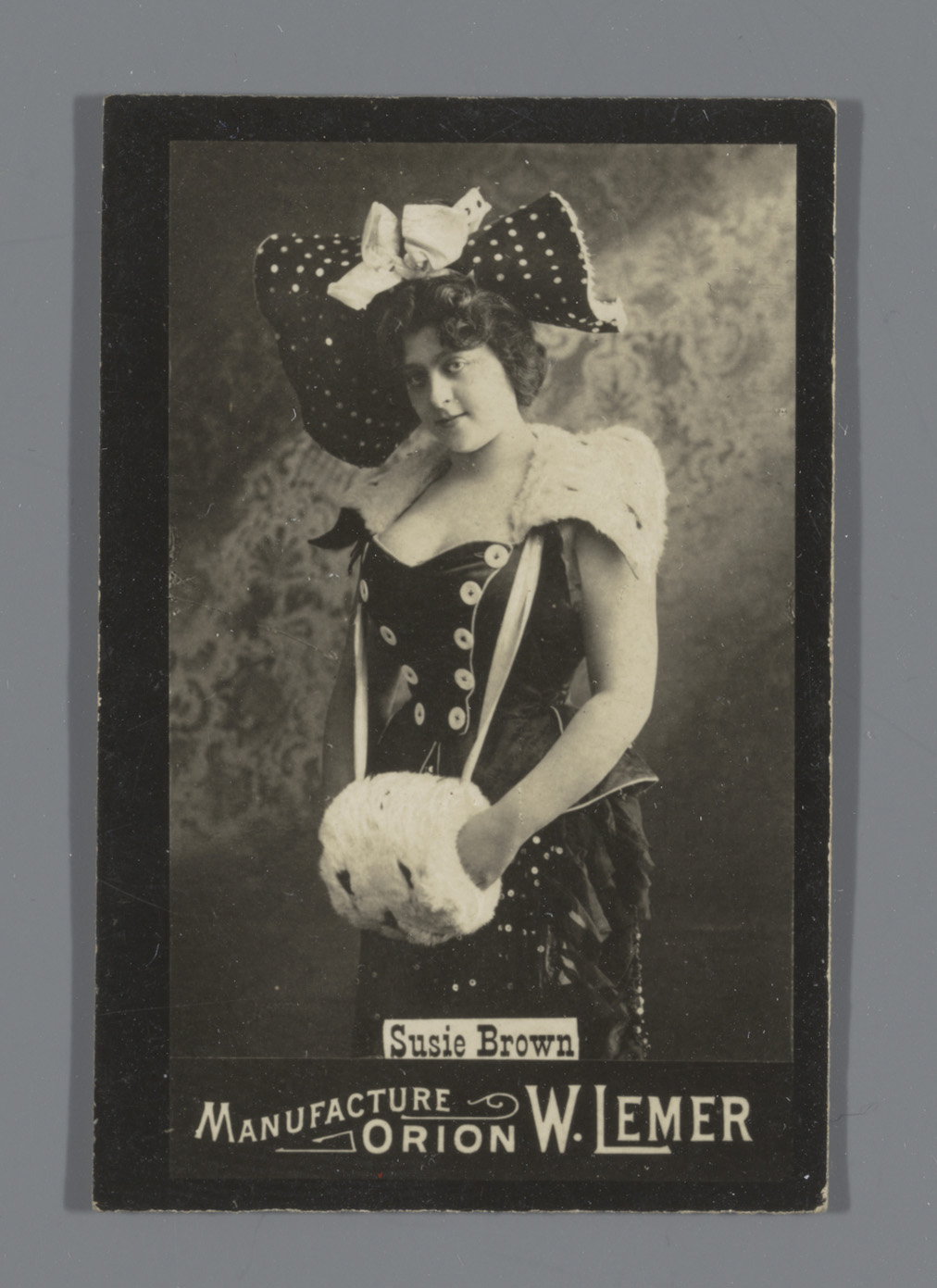 Portret van Susie Brown met hoed en mof, reclame voo...