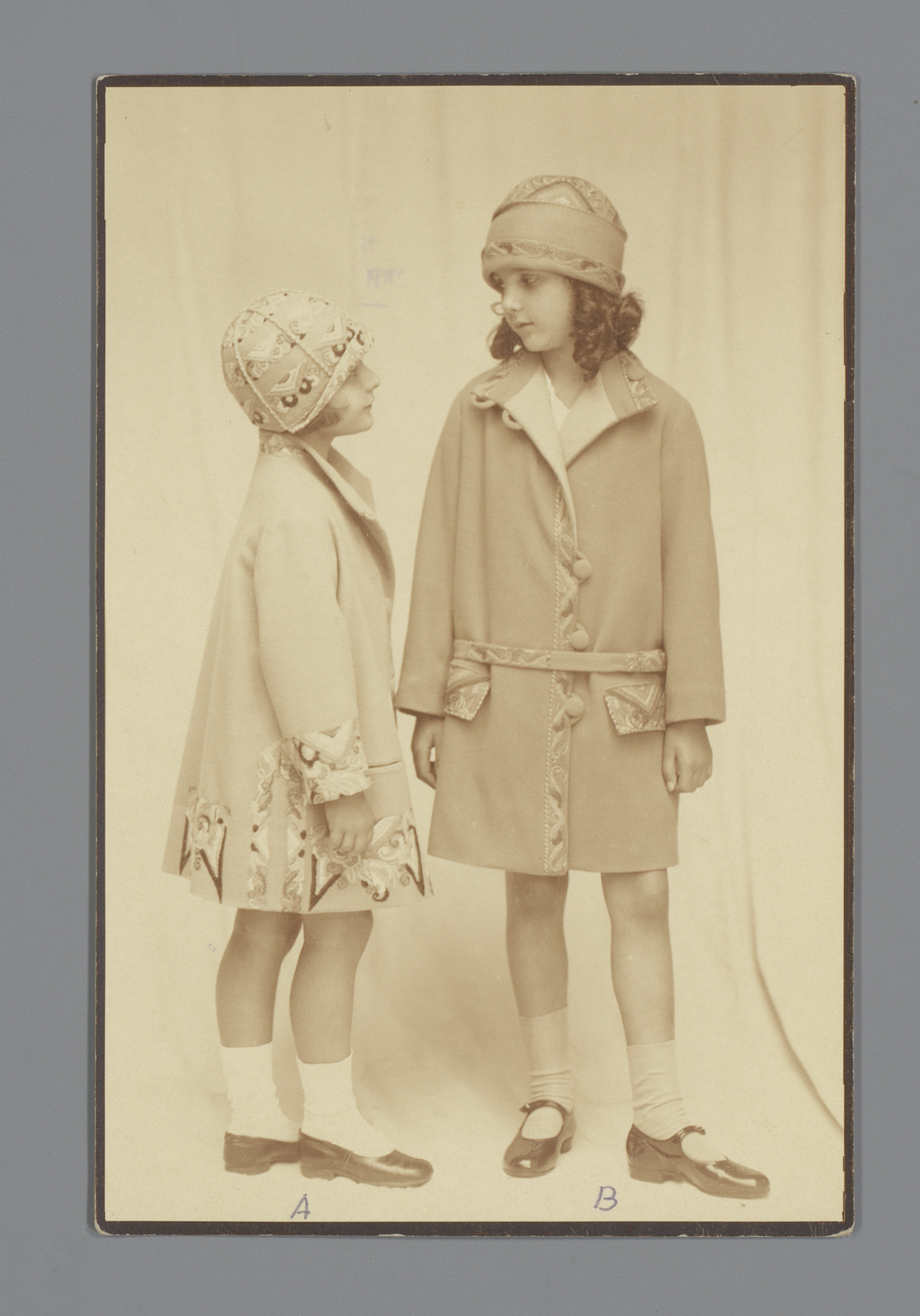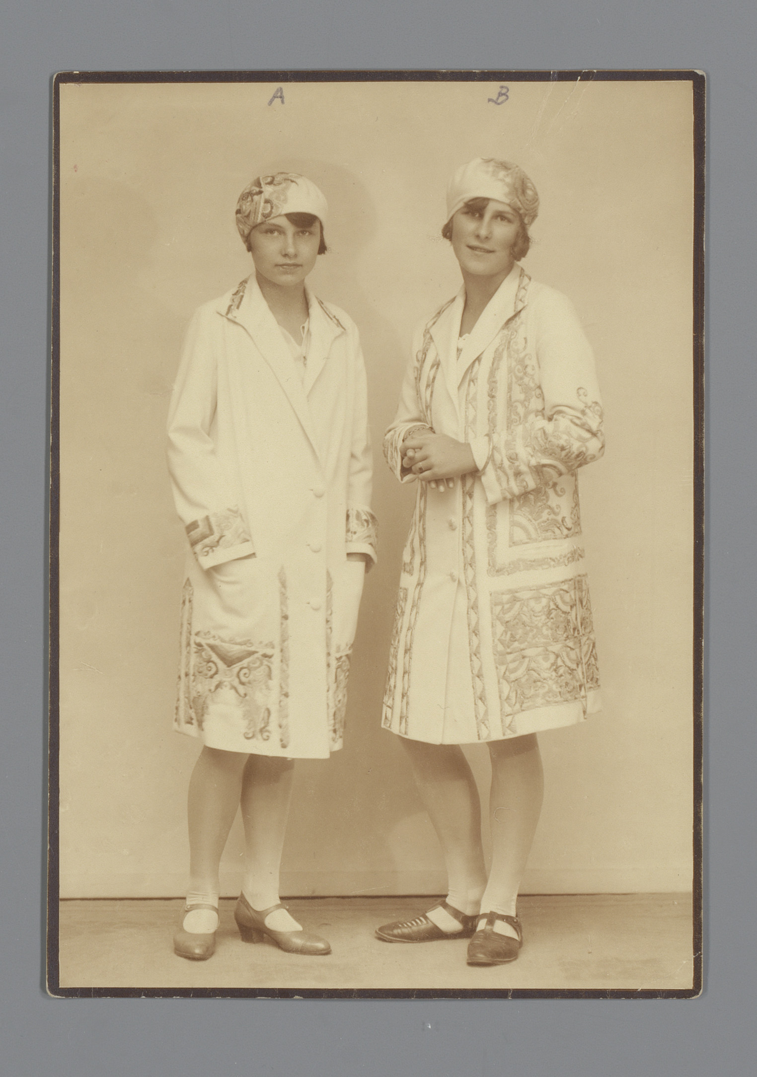 Twee modellen met geborduurde mantels en mutsen van ...