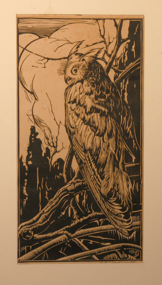 Houtgravure voorstellende een uil, vervaardigd door ...