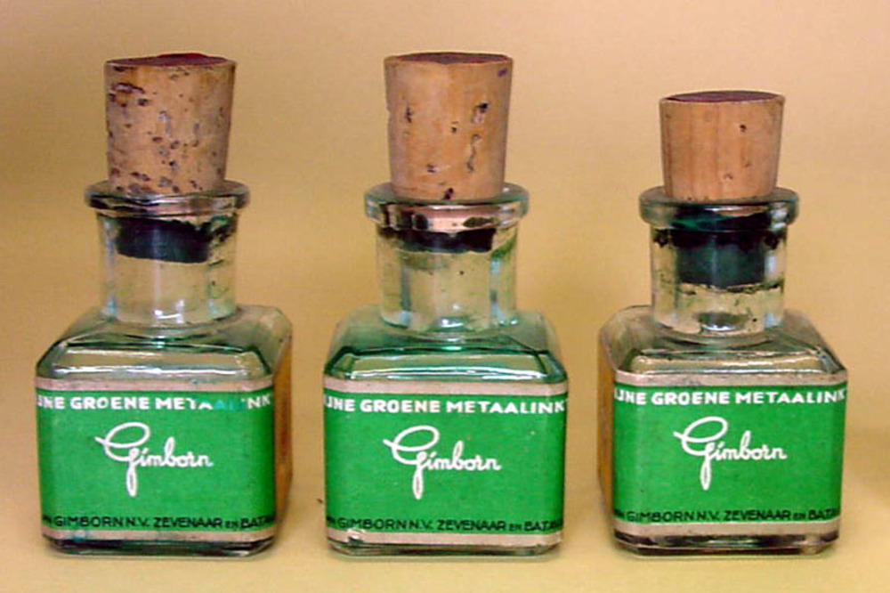 Zes inktflesjes van glas met metaalinkt door H. van ...
