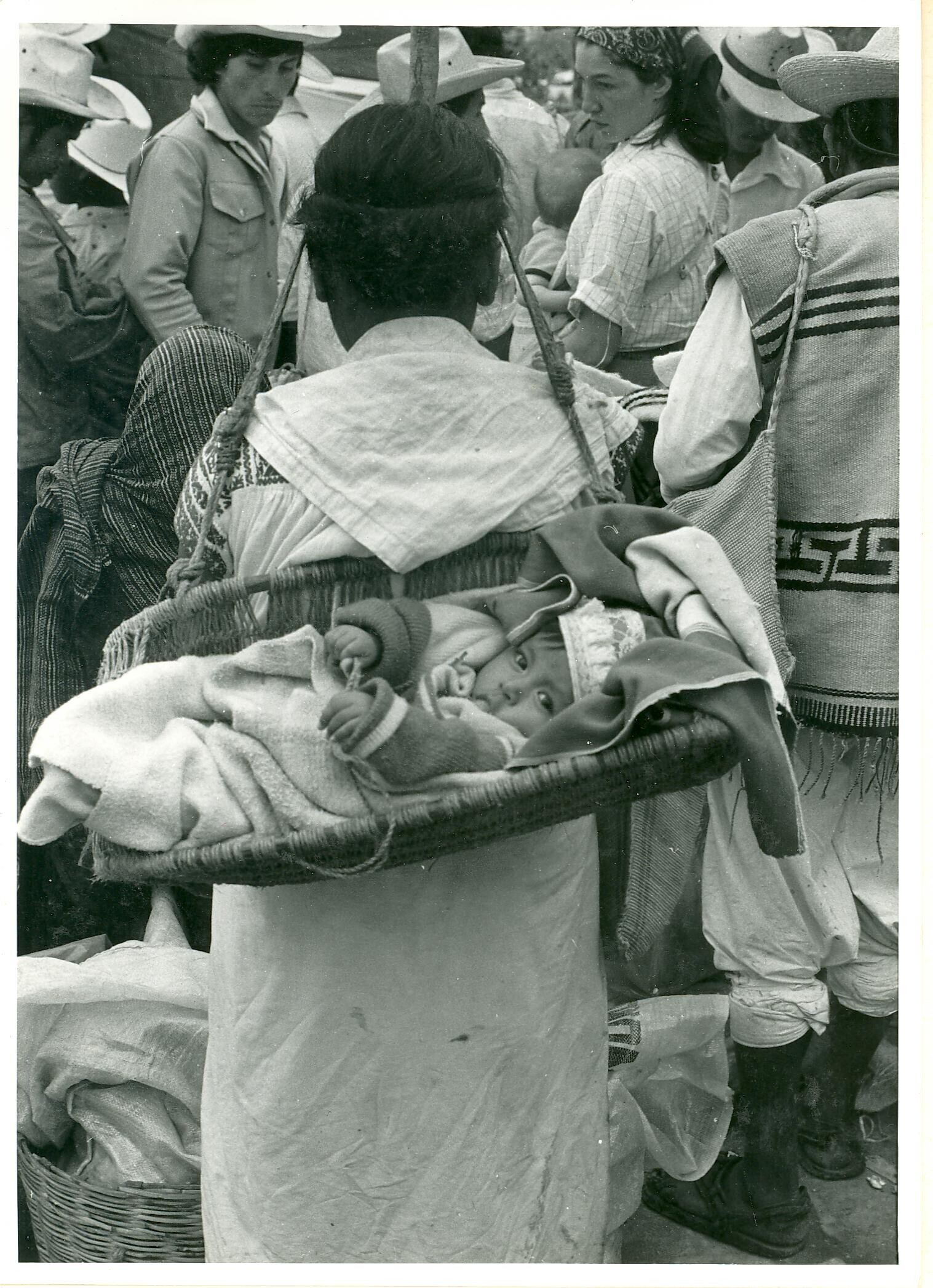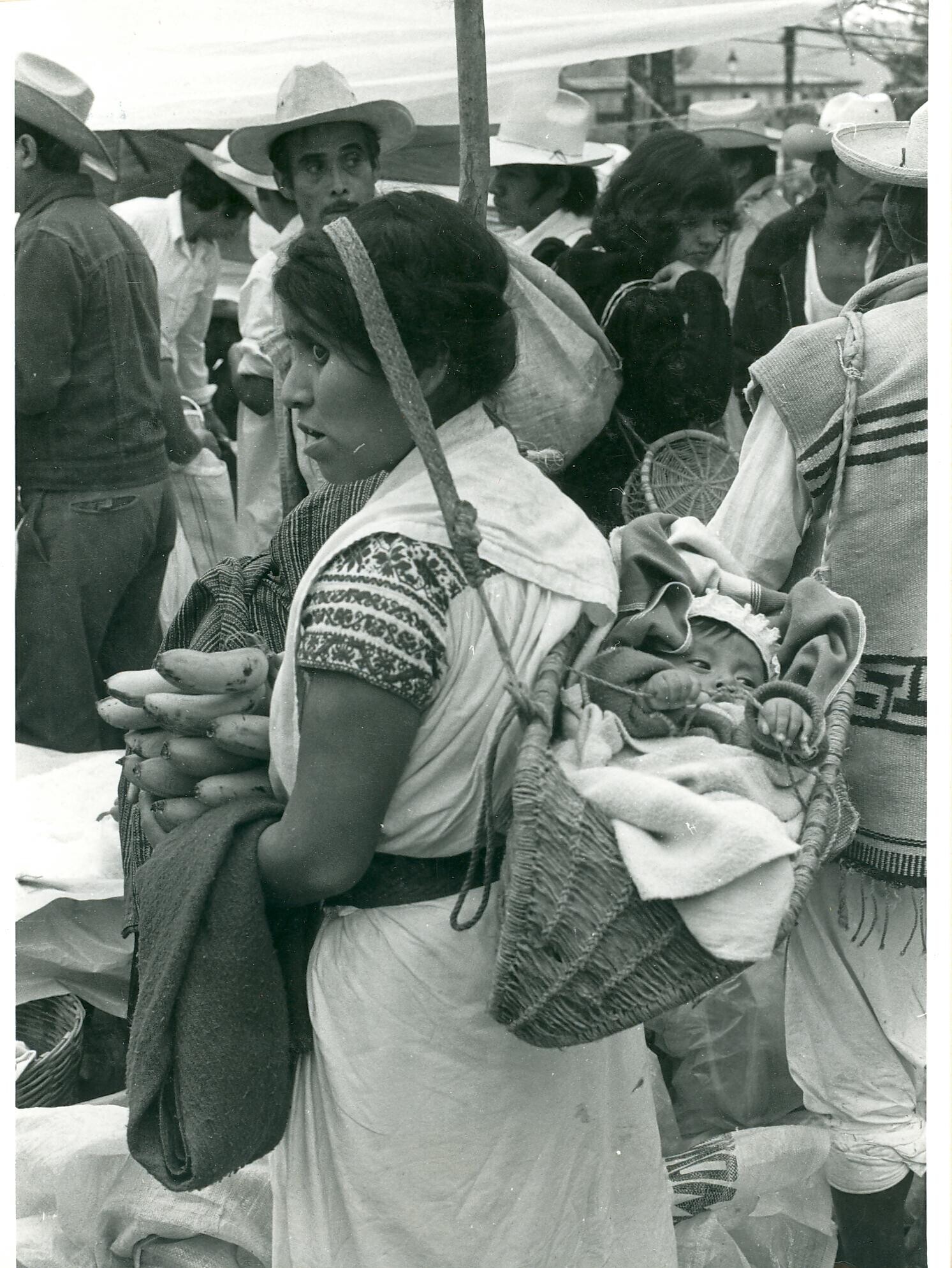 vrouw met kind in "hua'cal" (draagmand in de Cuetzal...