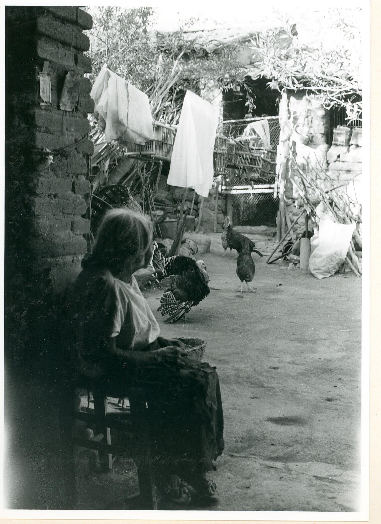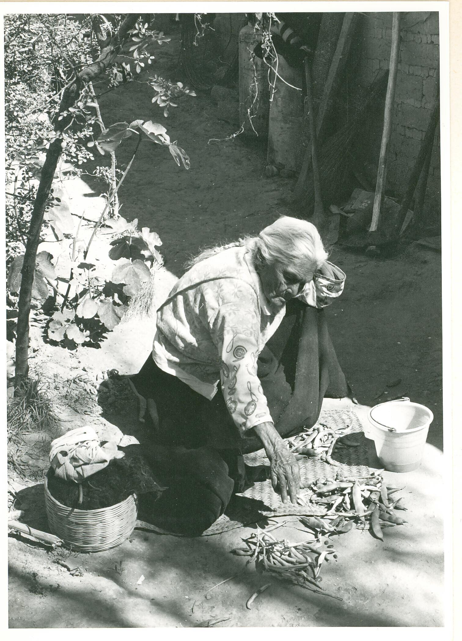 vrouw, bonen pellend, op erf van Doña Loreto Jarriza