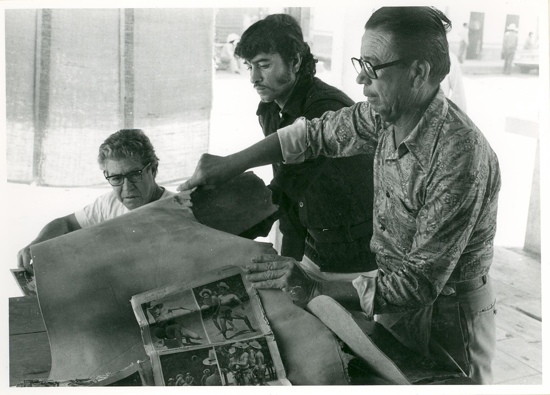 Caco Bernal in zijn winkel, met op voorgrond tijdsch...