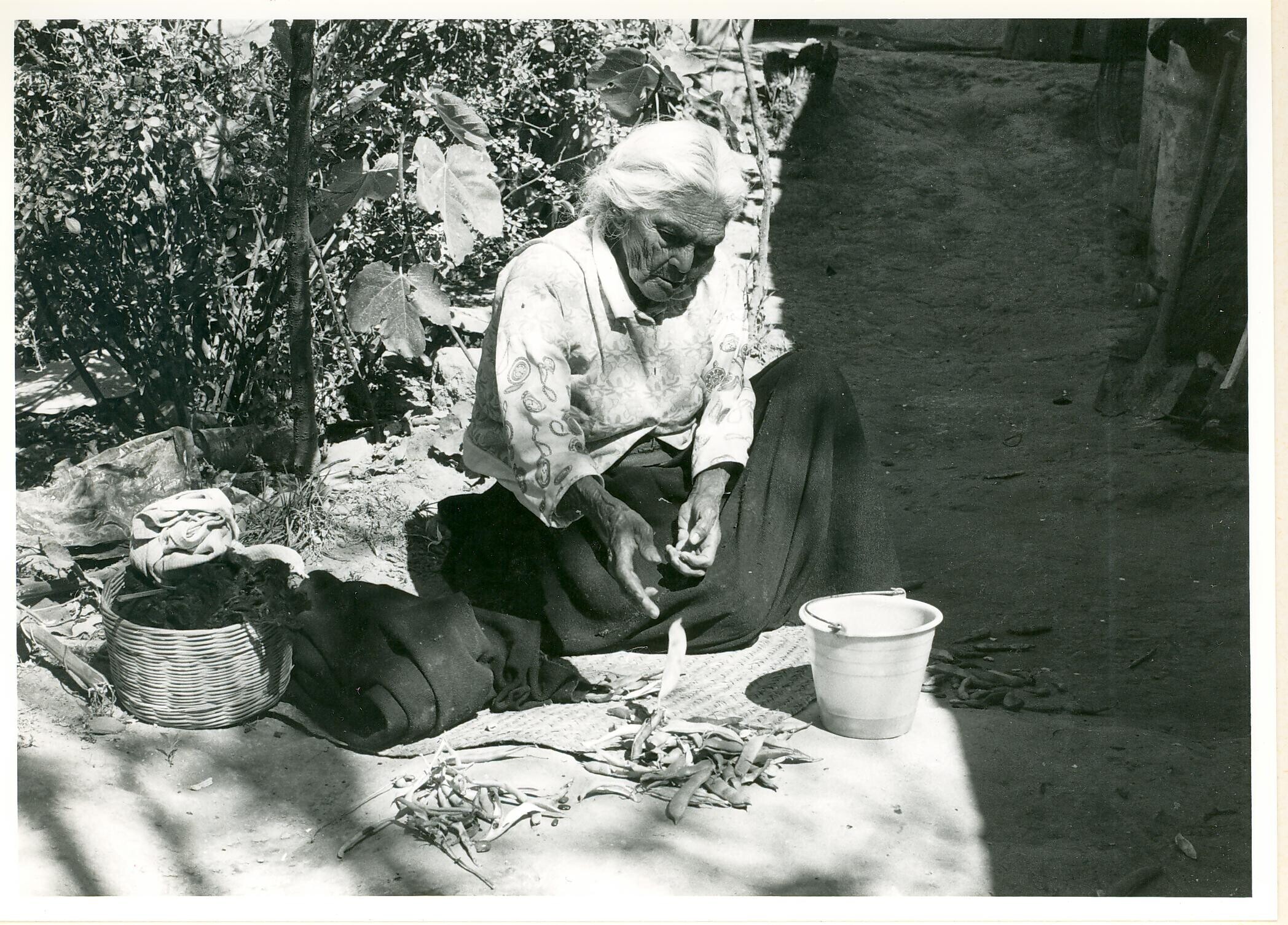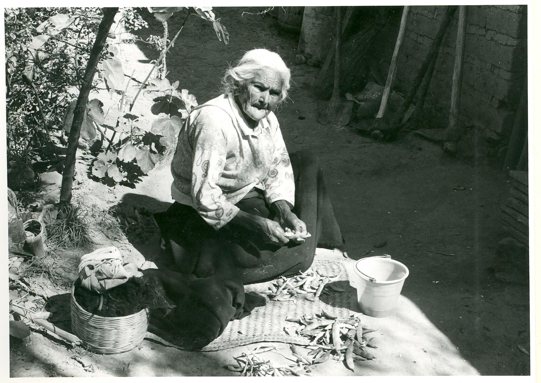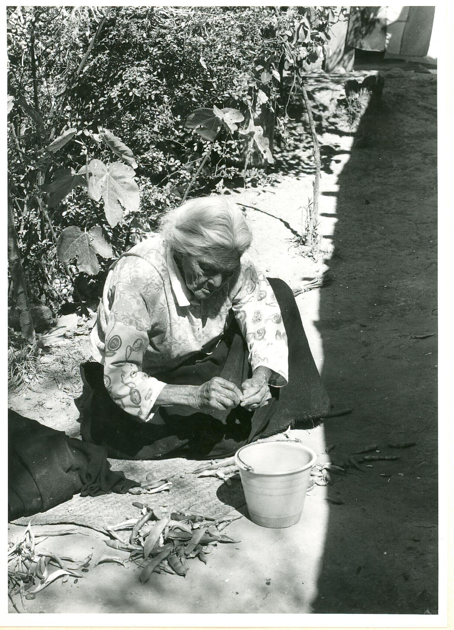 vrouw, bonen doppend, op erf van Doña Loreto Jarriza