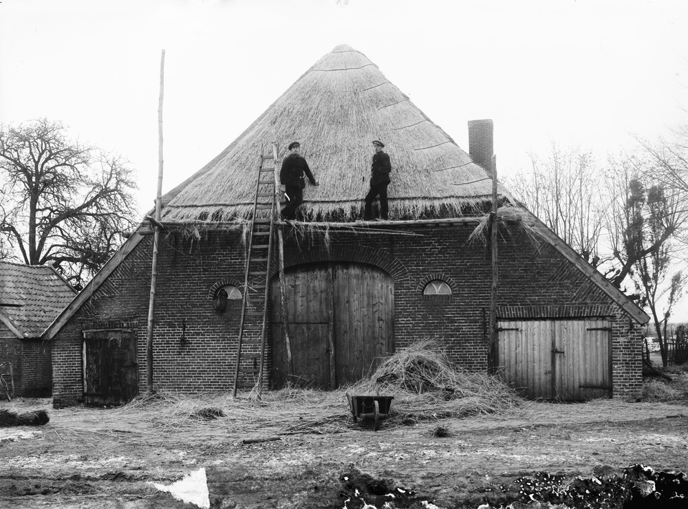 Rietdekkers aan het werk met de kap van een Veluwse ...