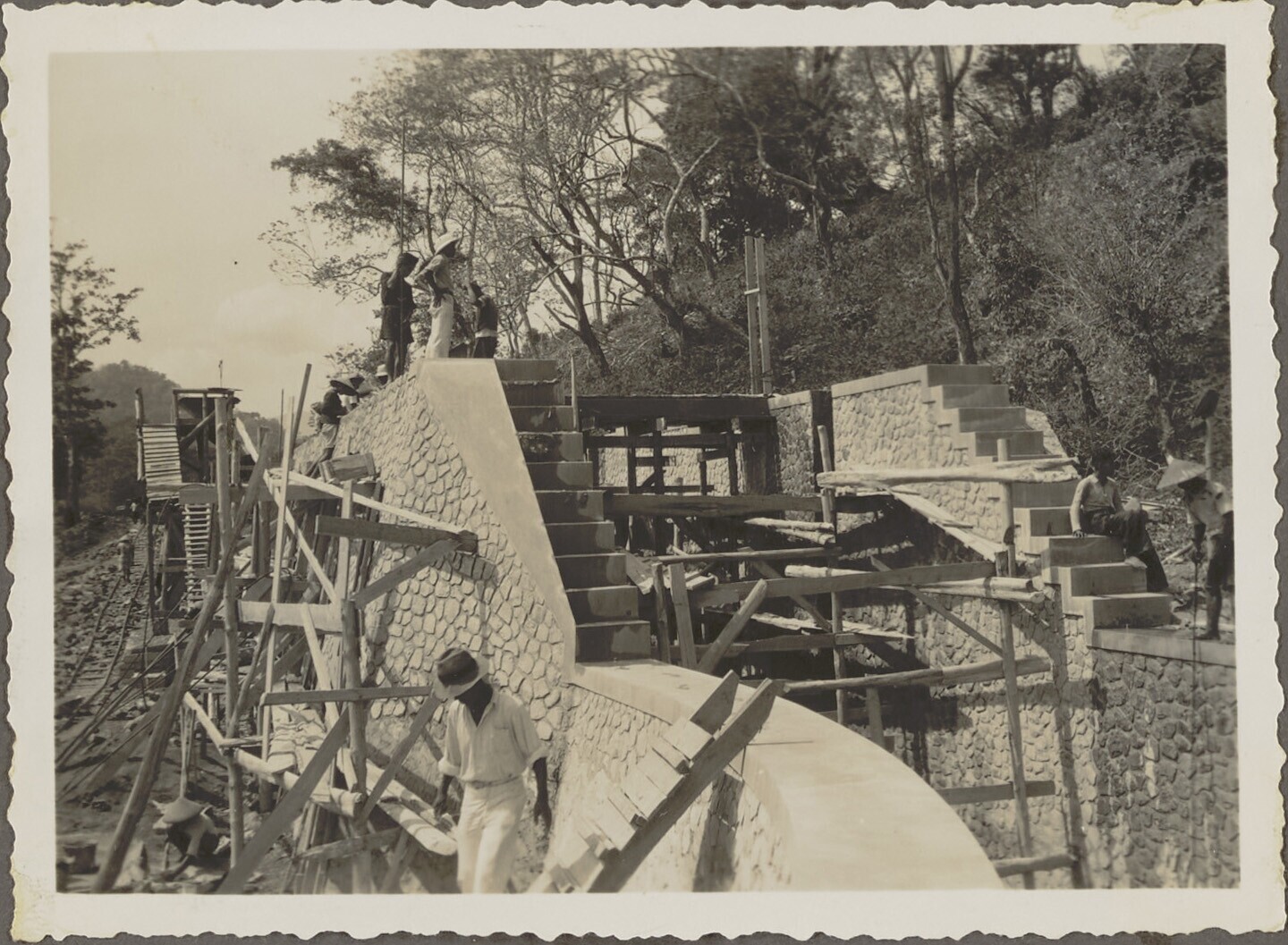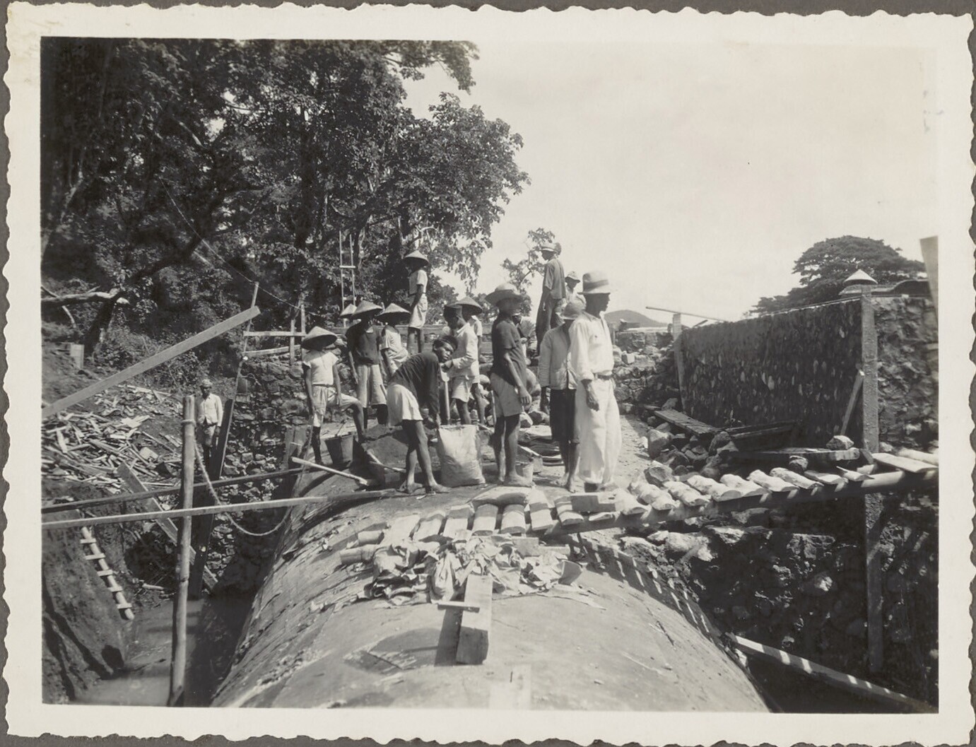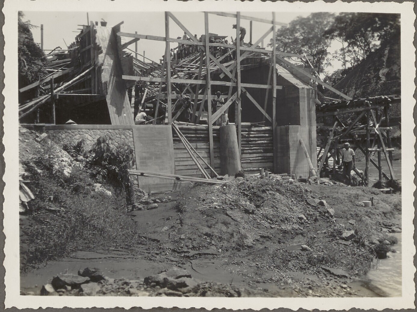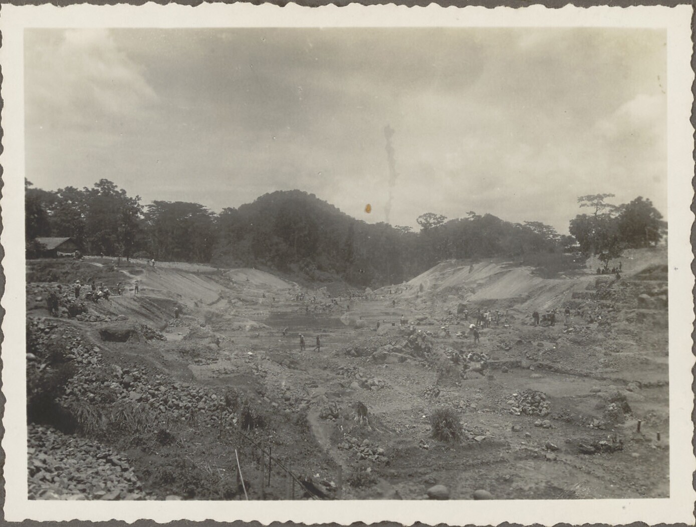 Aanleg van overlaat bij Kratjak door Javaanse arbeiders