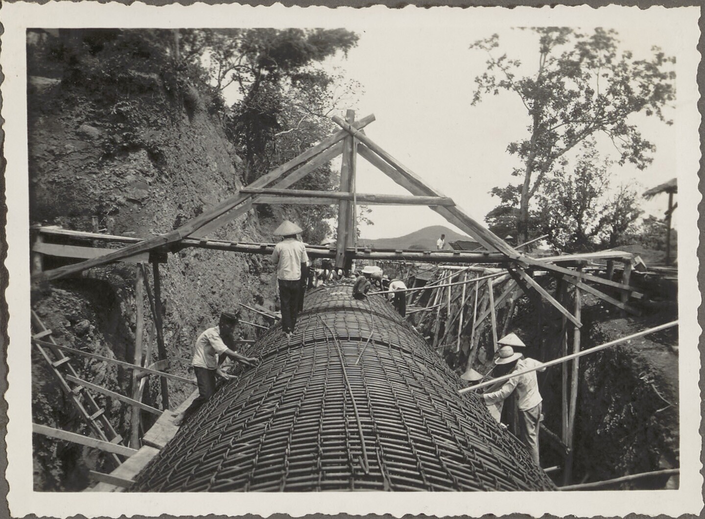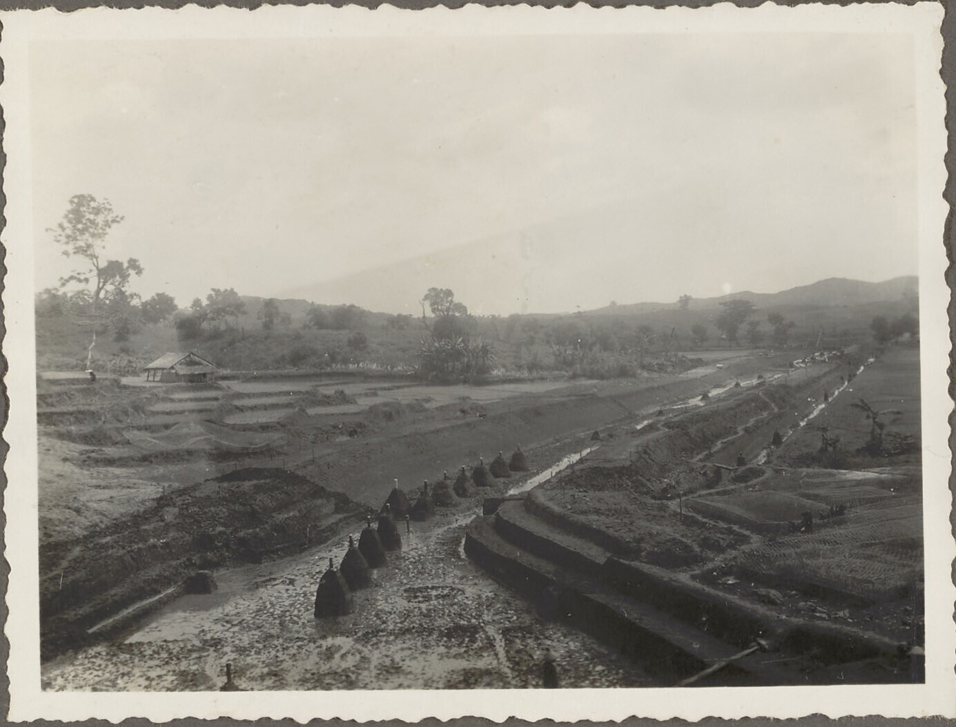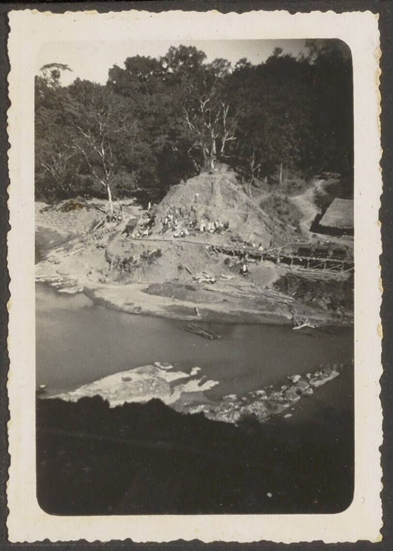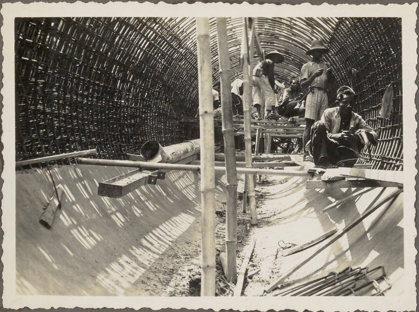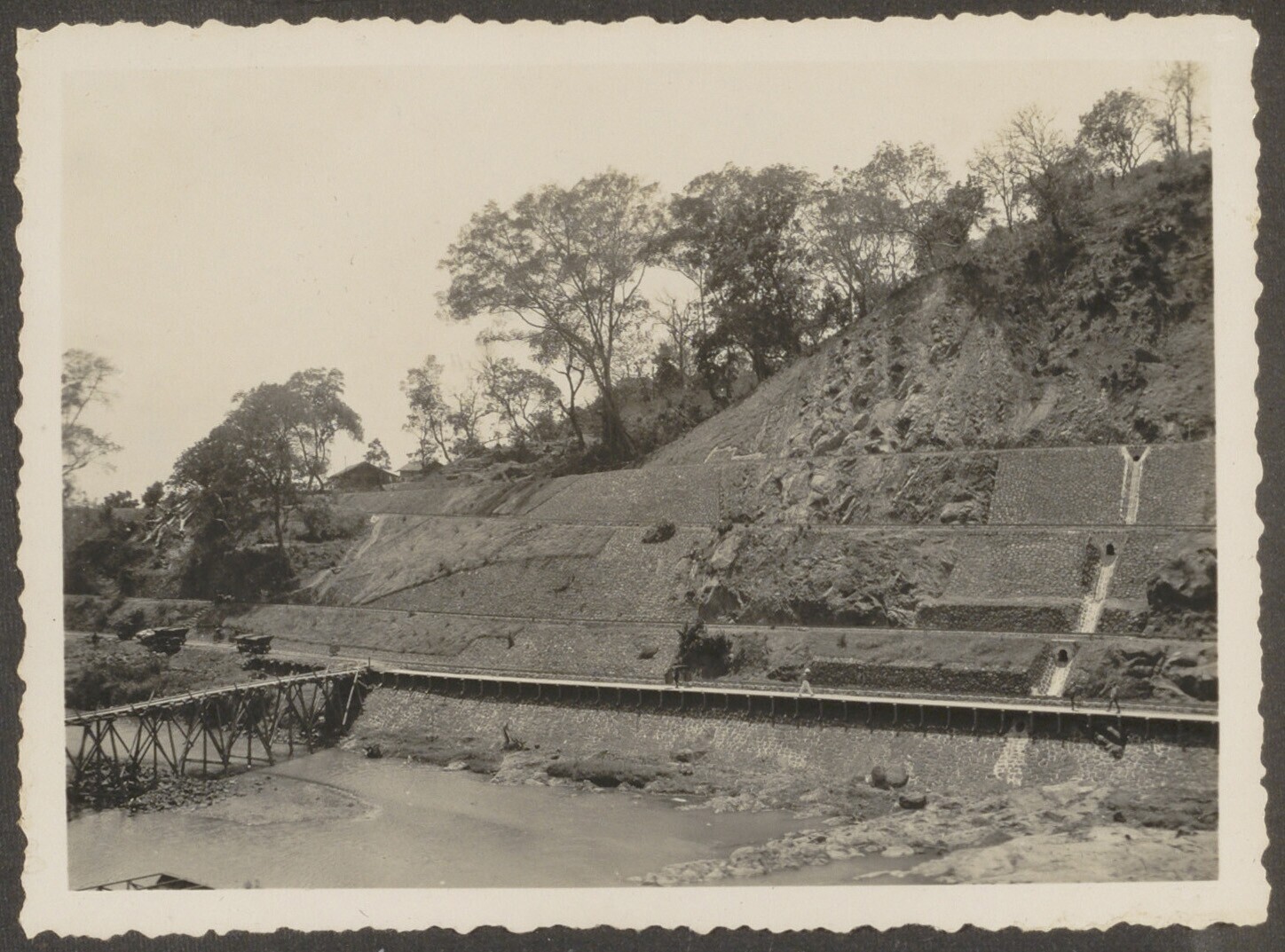Aanleg van overlaat bij Kratjak door Javaanse arbeiders
