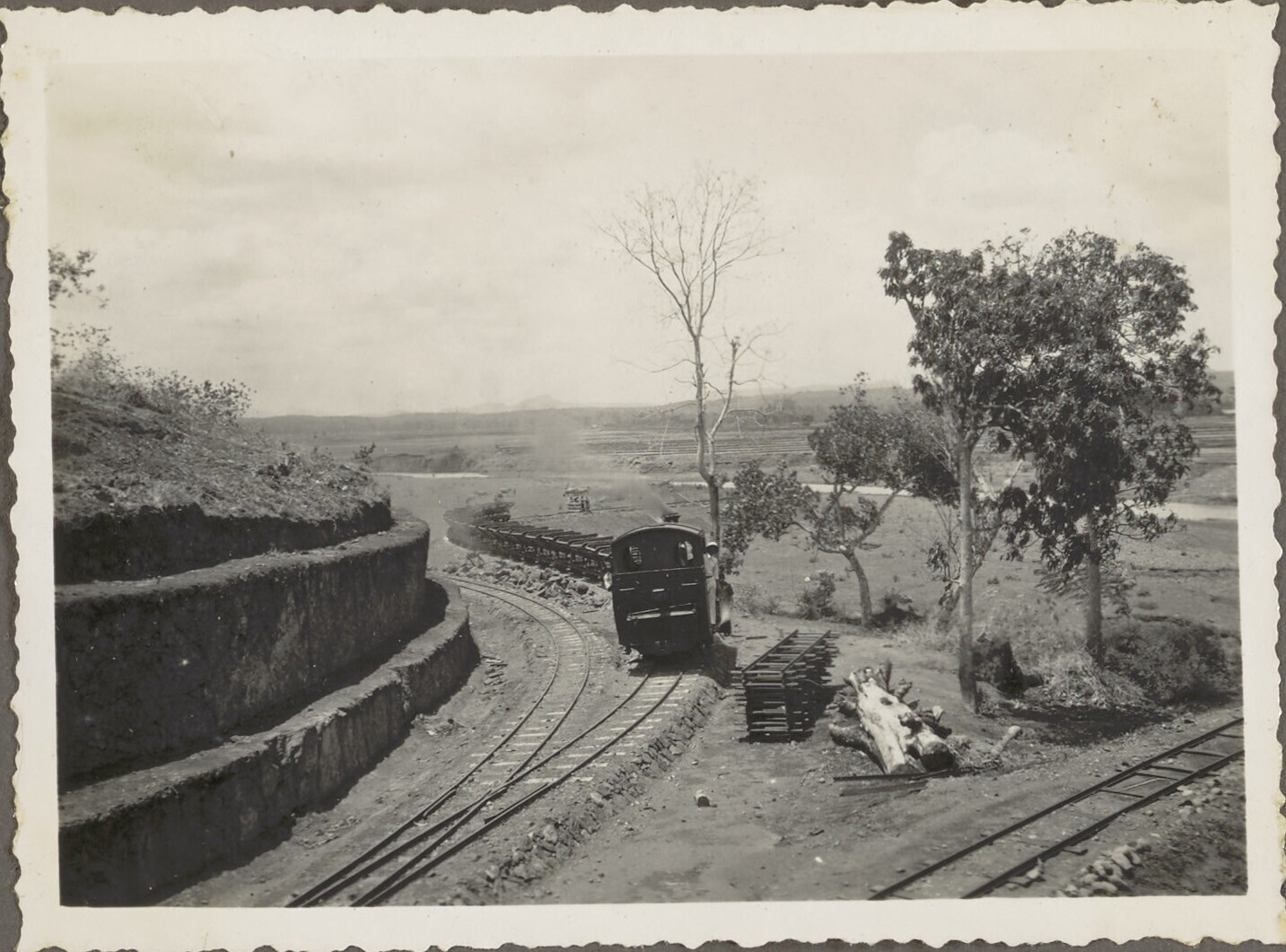 Steenwinning bij Goenoengbara met heuvels van Tjolom...