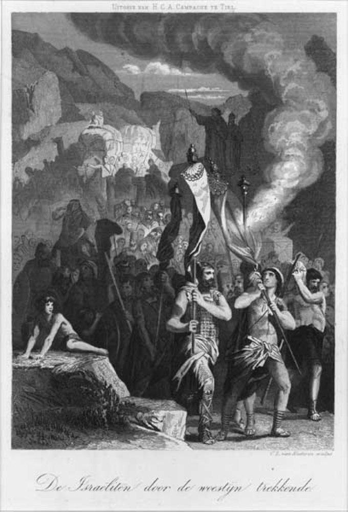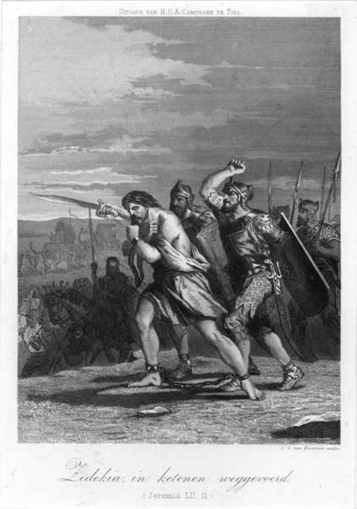 Gravure, voorstellende Zedekia, die in ketenen wordt...