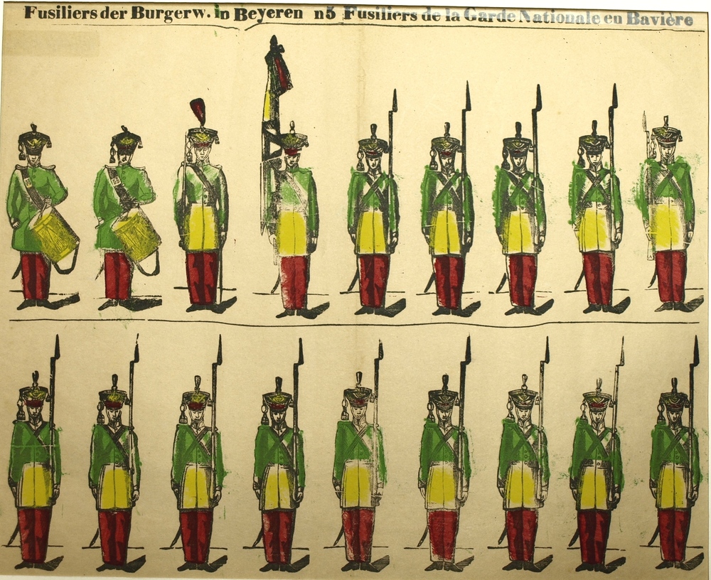 Centsprent met twee rijen van negen soldaten met tam...