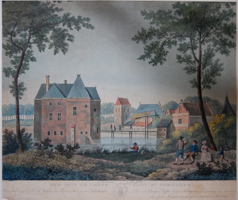 gezicht huis Loevestein, slotgracht, brug, bijgebouw...