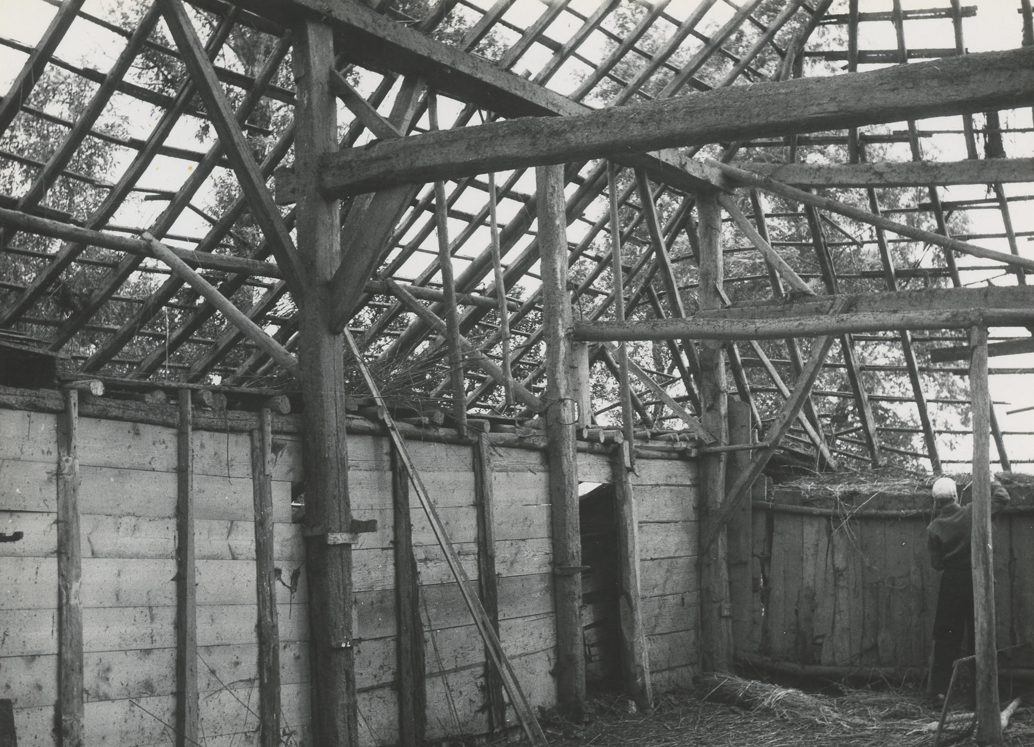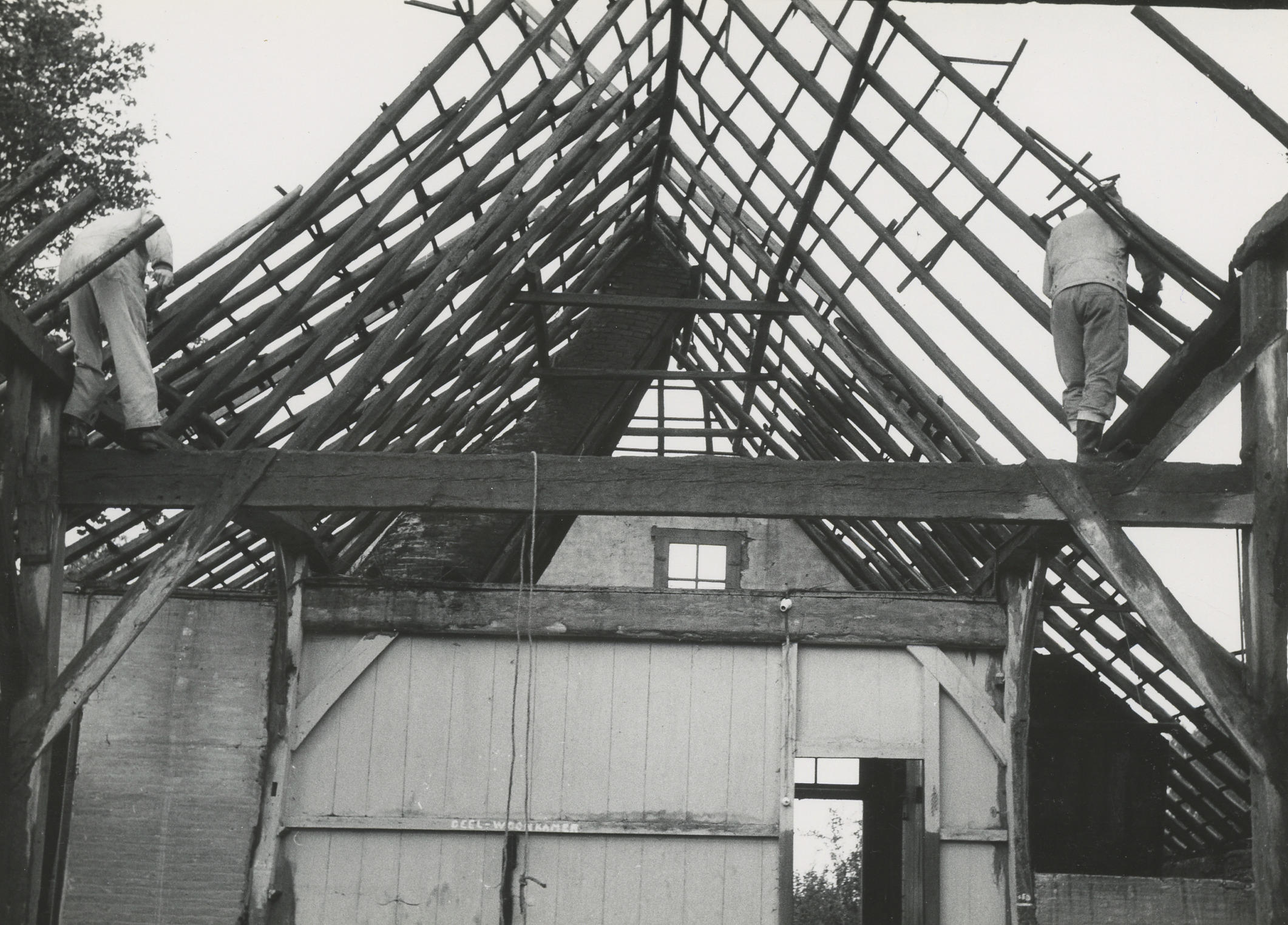 Museummedewerkers bij de afbraak van een boerderij, ...