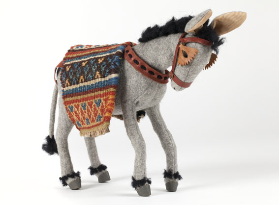 Grijze ezel met gekleurd dekkleed