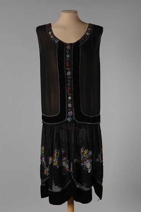 Zwarte crêpe japon, gegarneerd met kralen en fluwele...