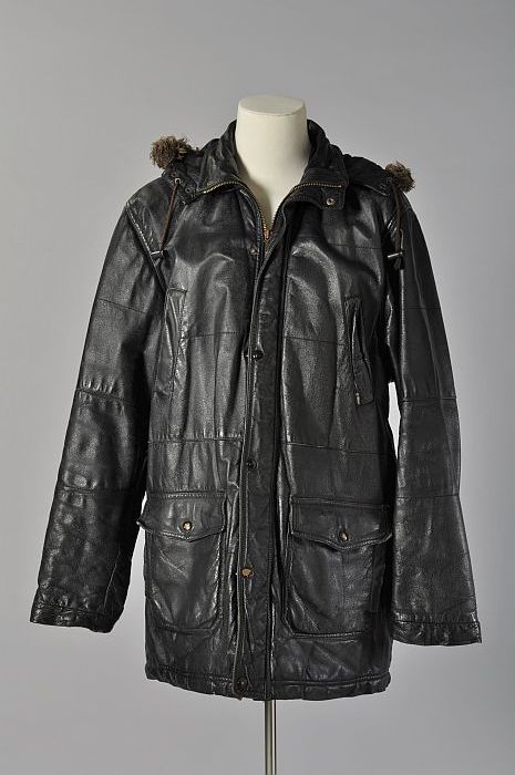 Zwarte leren jas met bontkraag en capuchon