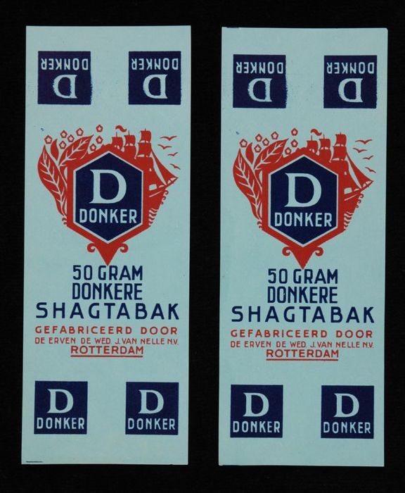Twee blauwe, papieren labels VAN NELLE DONKERE SHAGT...