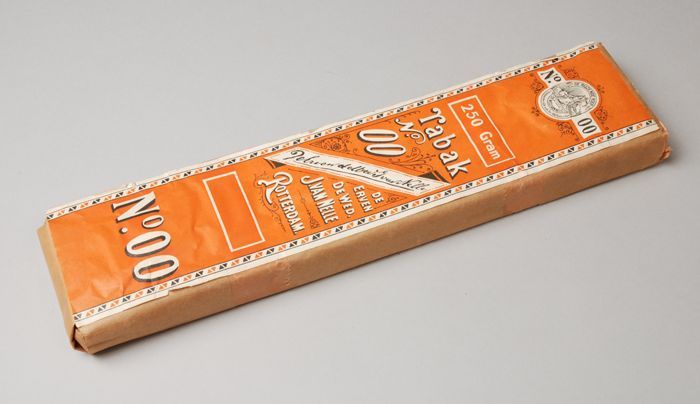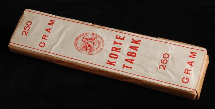 Bruin papieren wikkel waarin labels KORTE TABAK, 250...