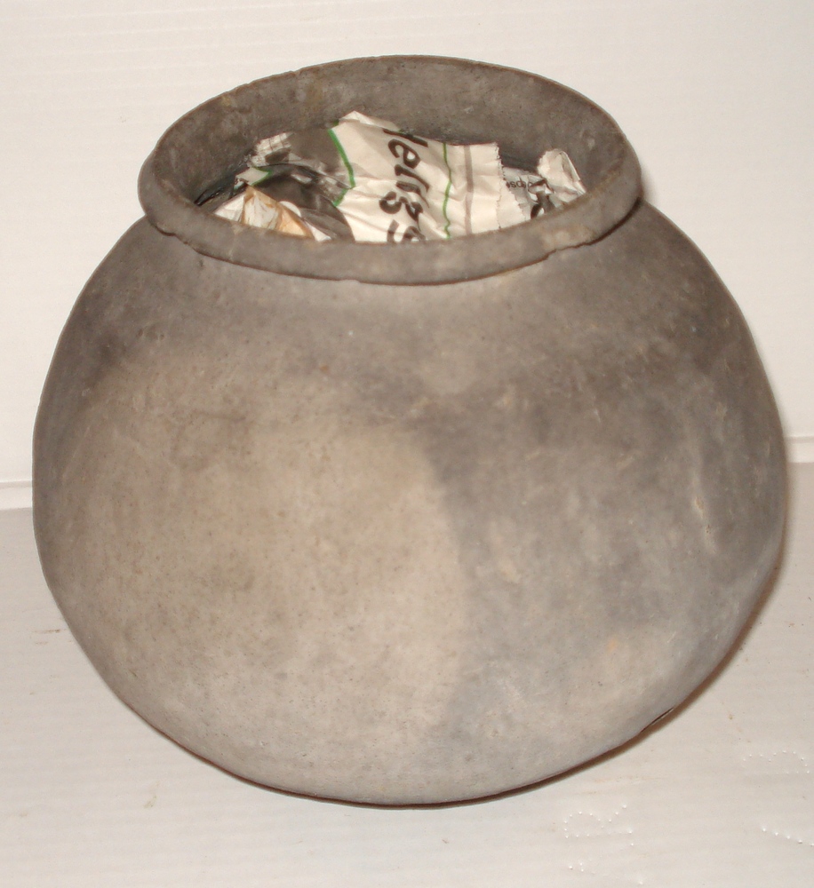 Kogelpot. Kogelvormig met ronde opening. Blauw grijs...