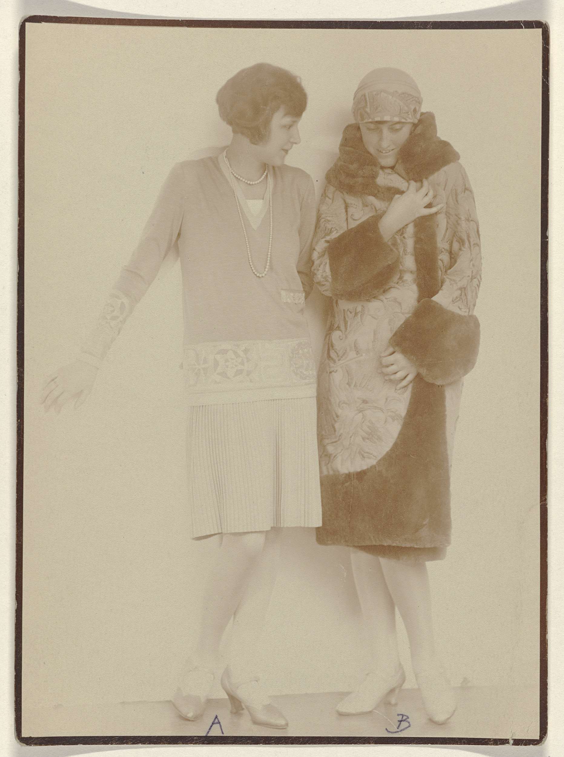 Twee modellen met een jurk, mantel en muts van de Wi...