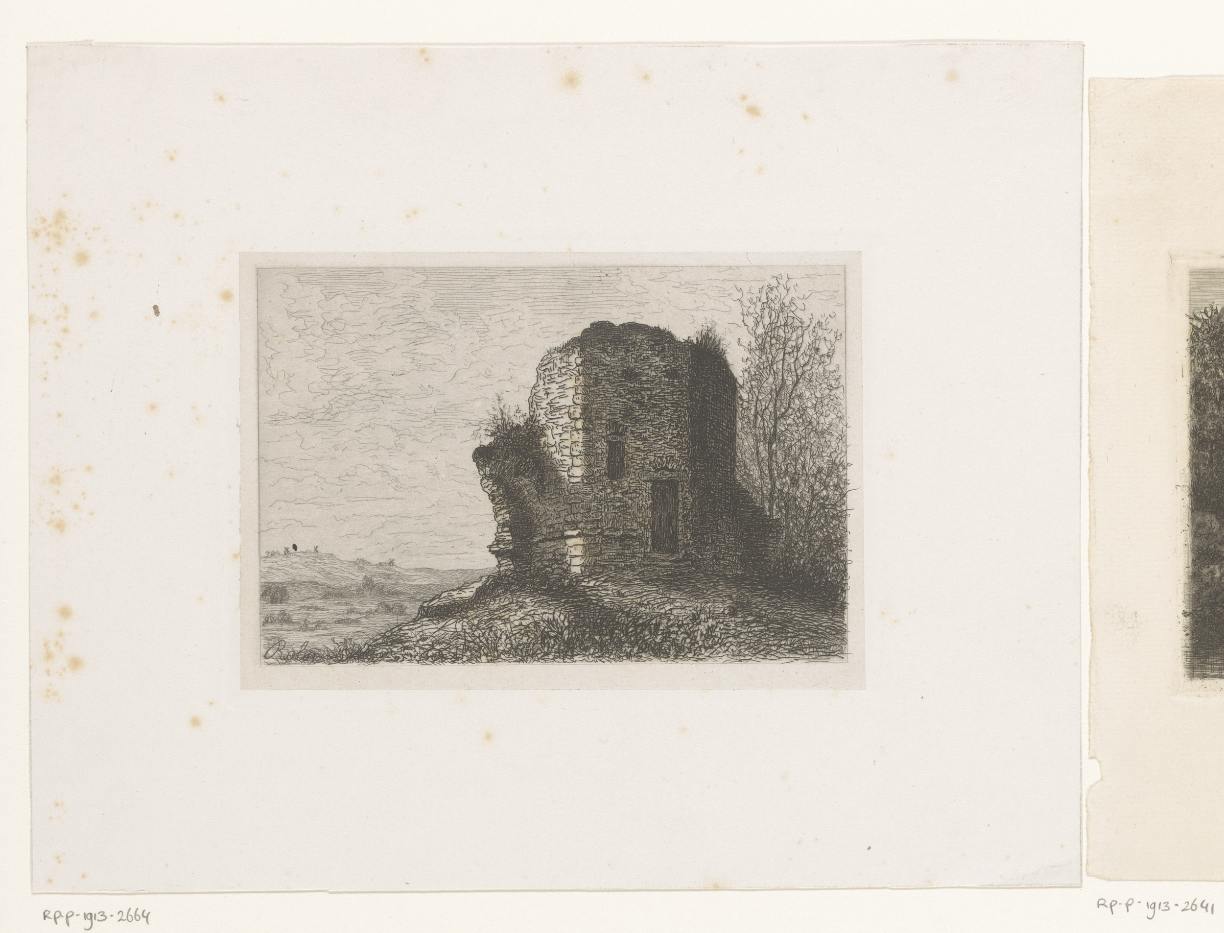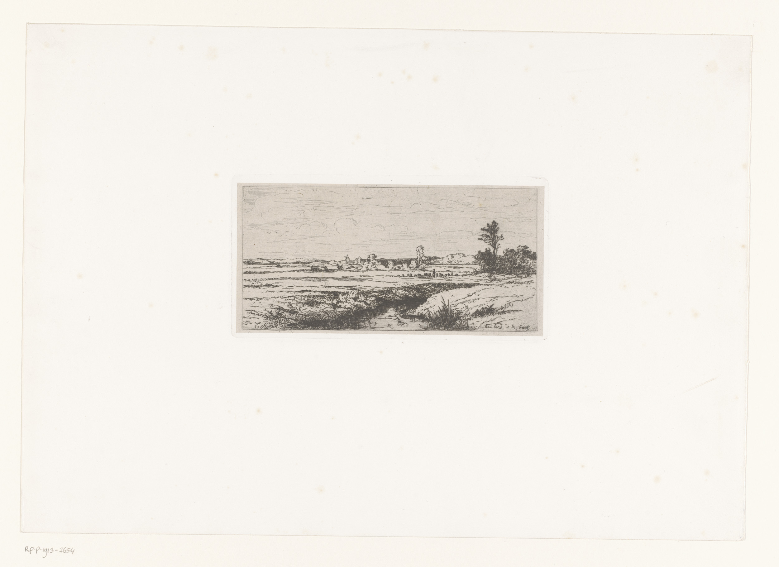 Heuvellandschap met hoge boom en een kerk op de acht...