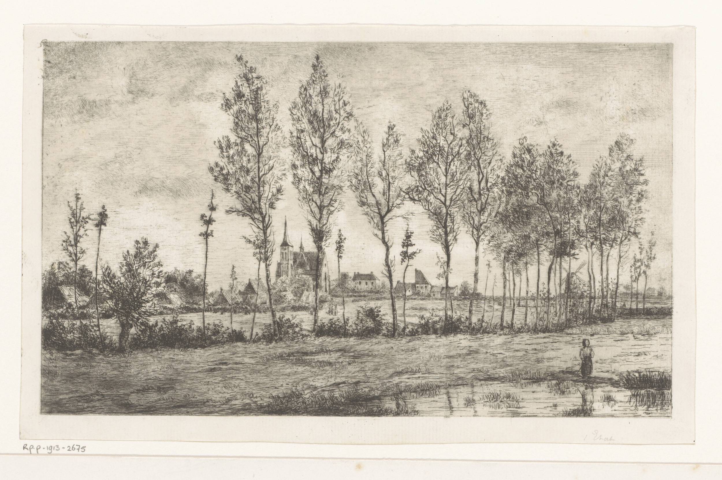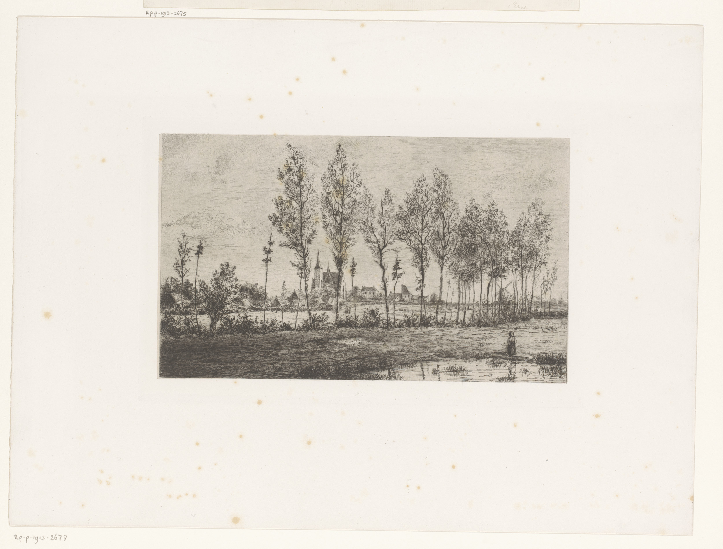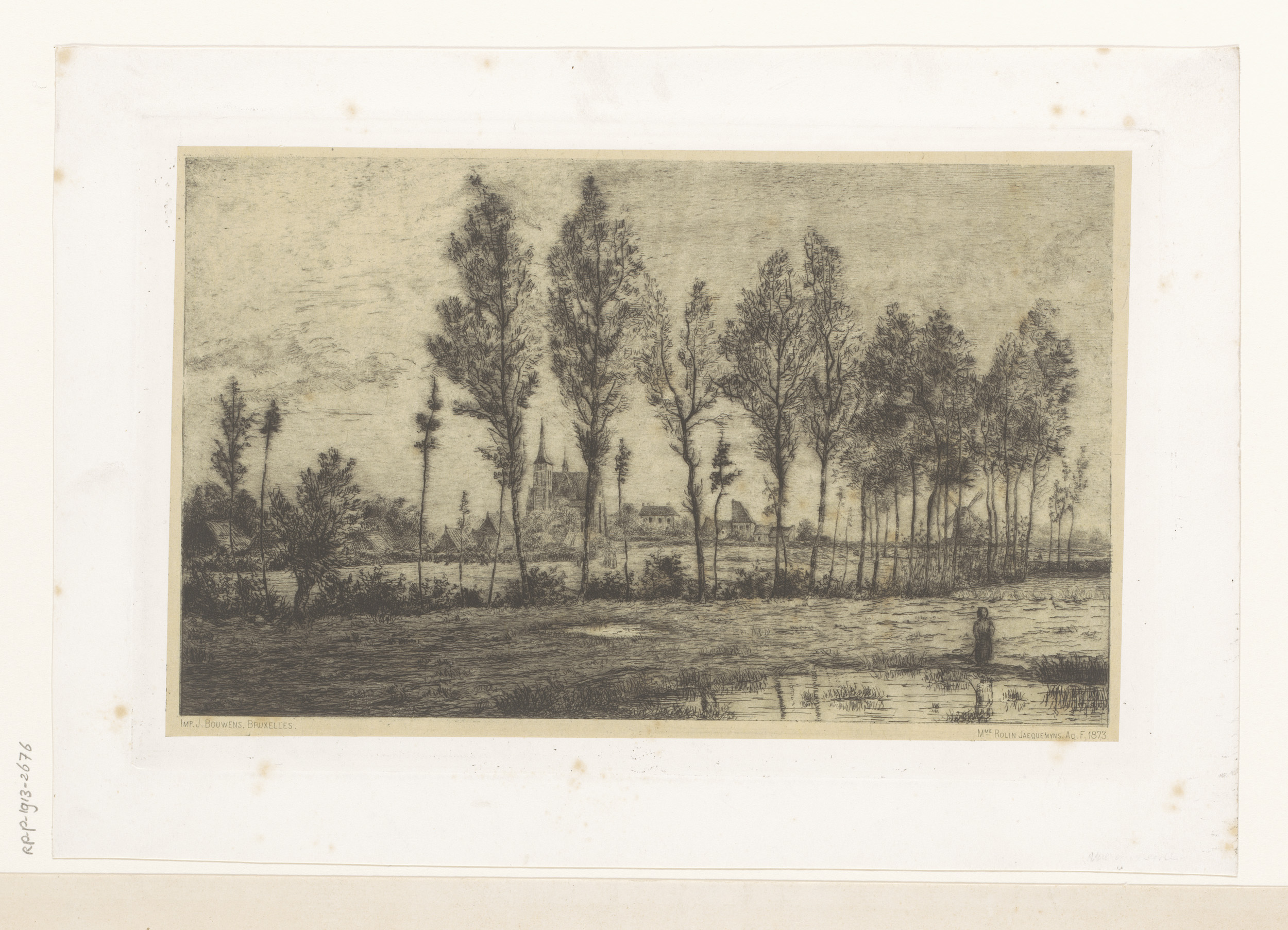 Gezicht op Meerle met bomenrij en water op de voorgrond