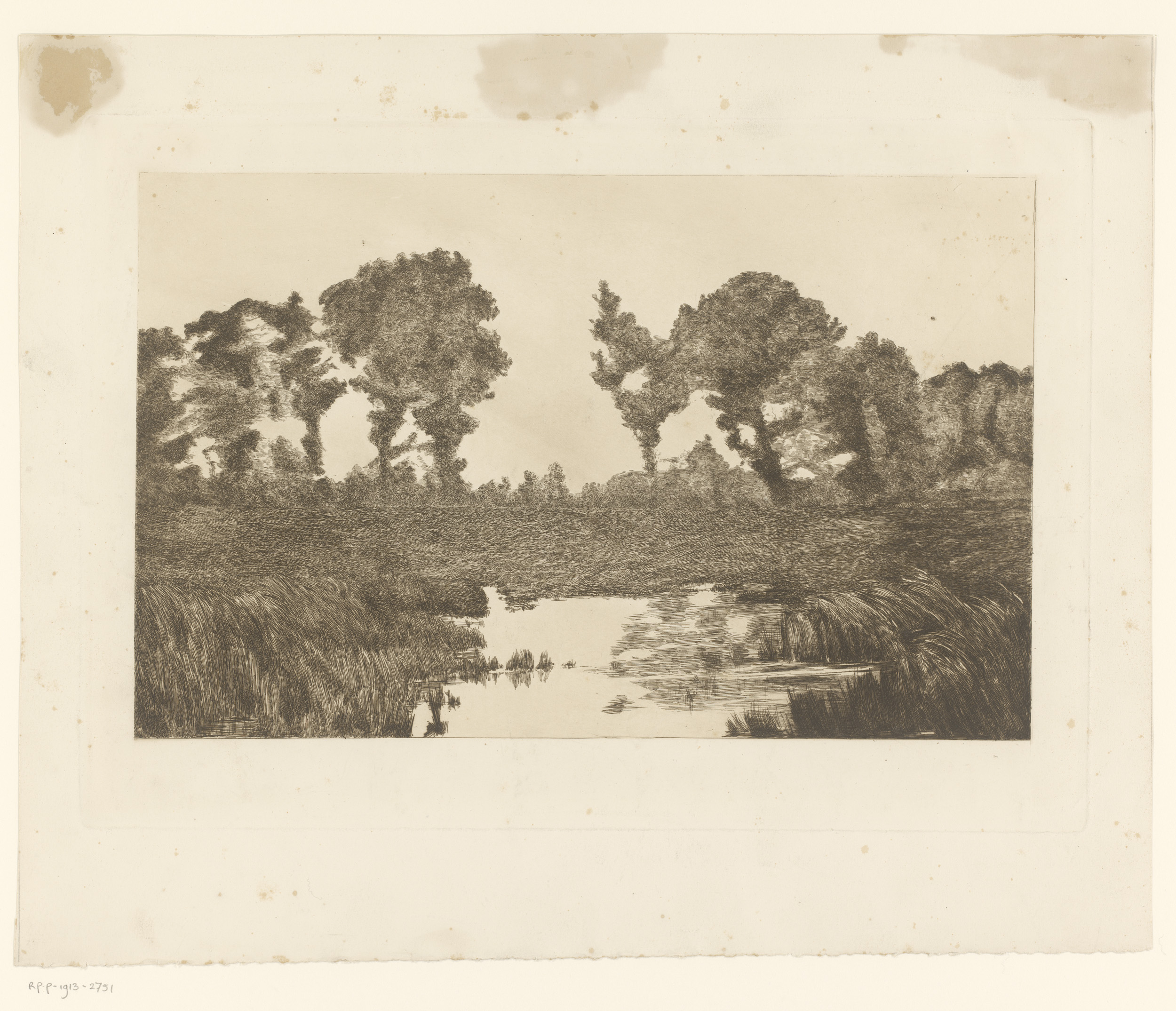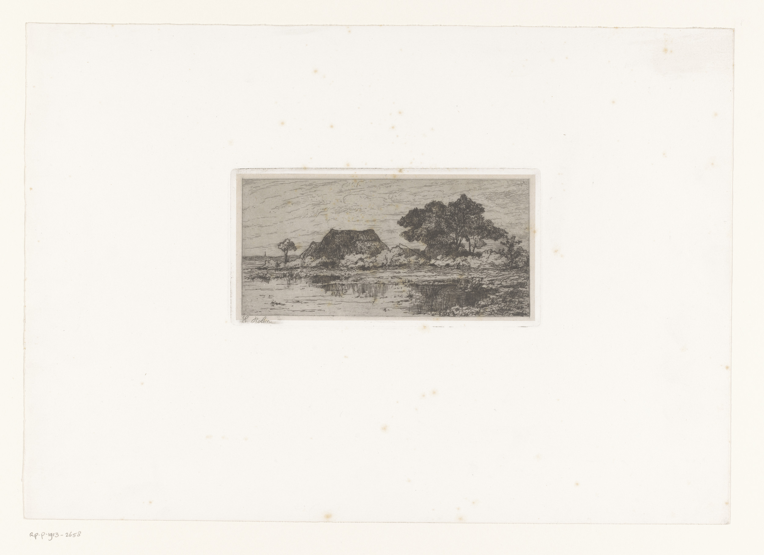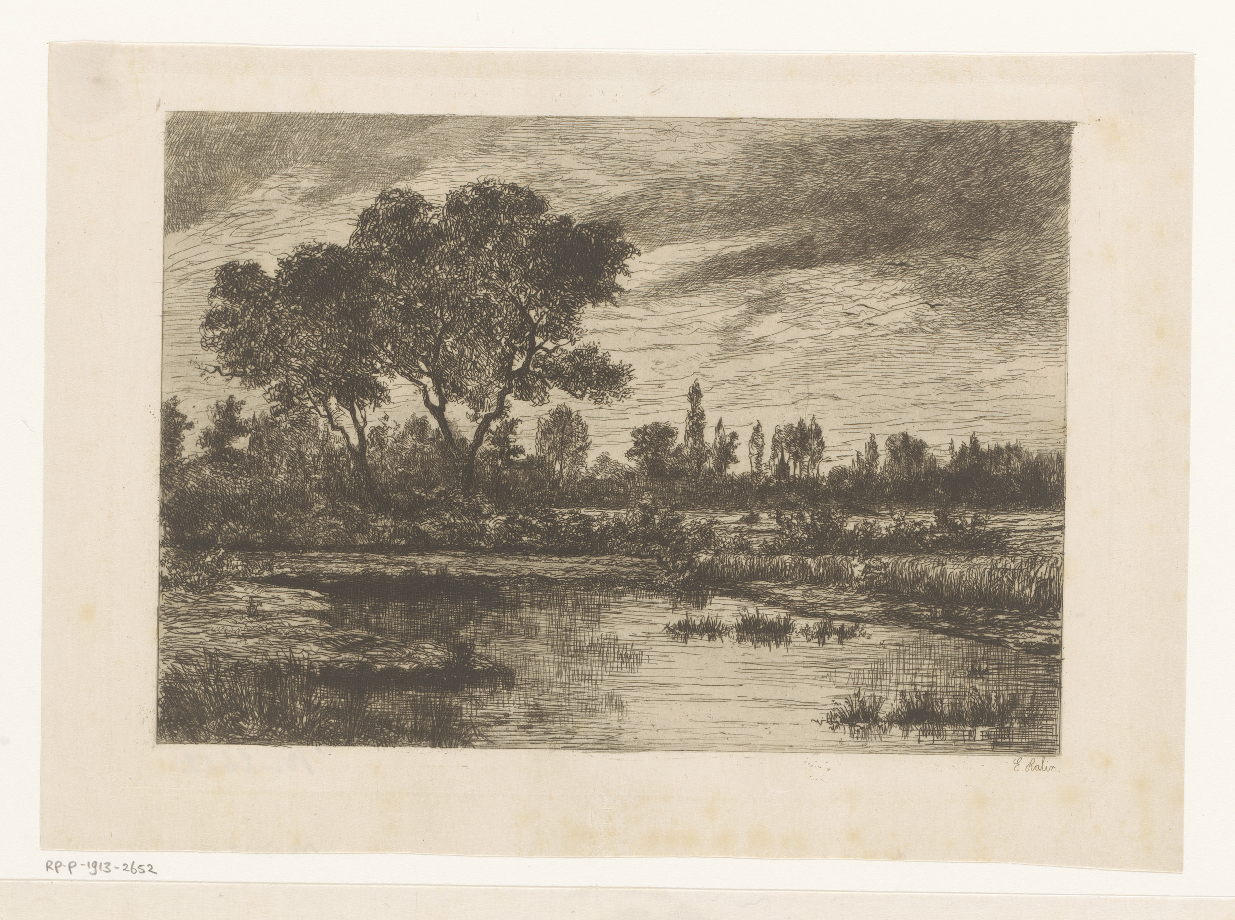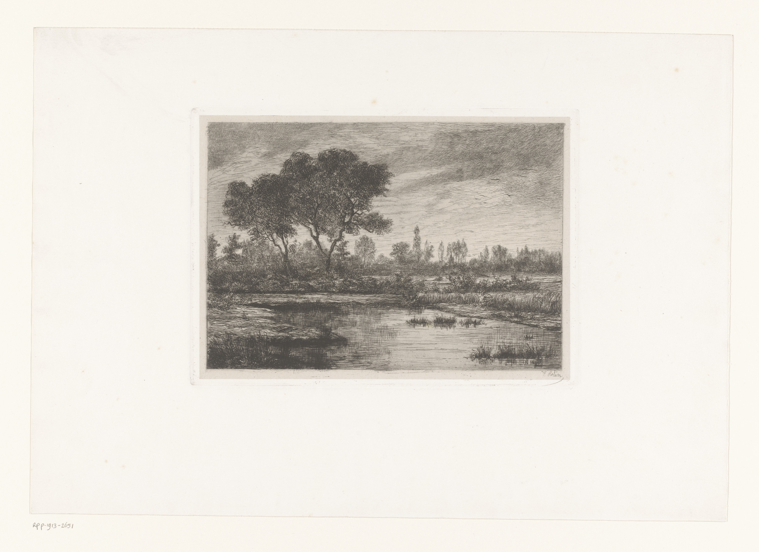 Gezicht op Meerle met bomenrij en water op de voorgrond