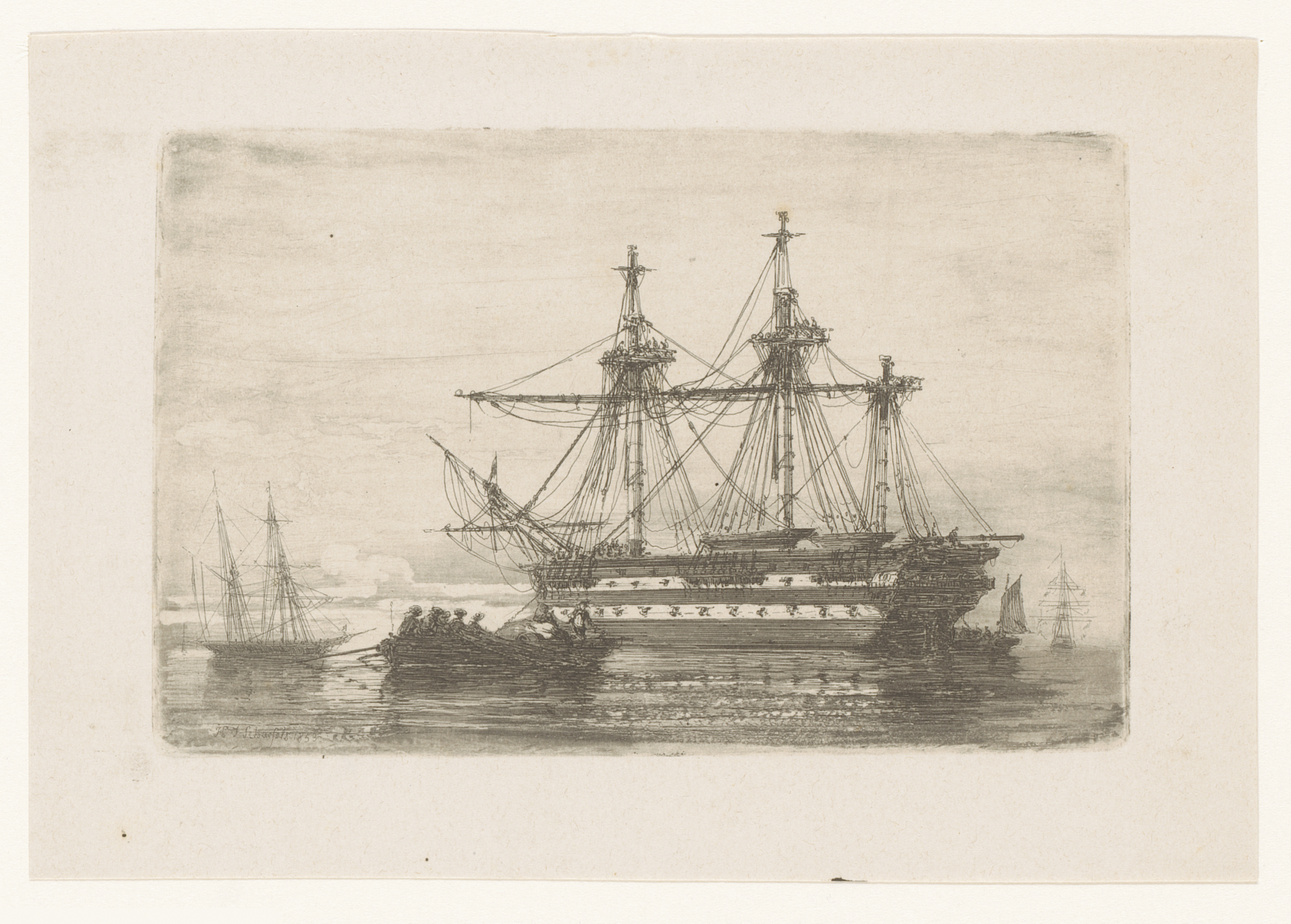 Strijdende bemanningsleden op het zinkende schip Le ...