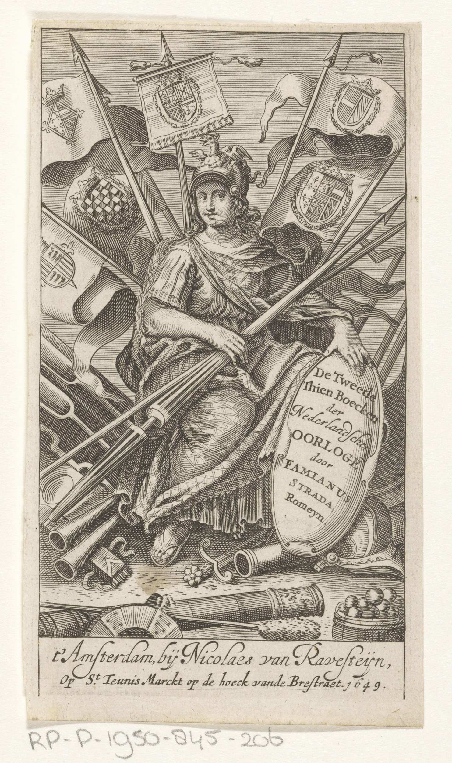 Vrouwelijke personificatie met vlaggen en wapens