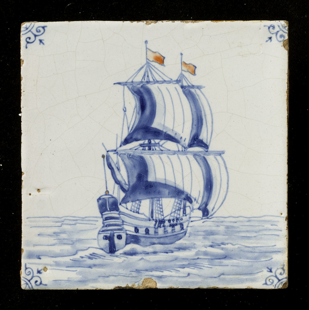 Tegel in tinglazuur, voorstellende scheepvaarttafere...
