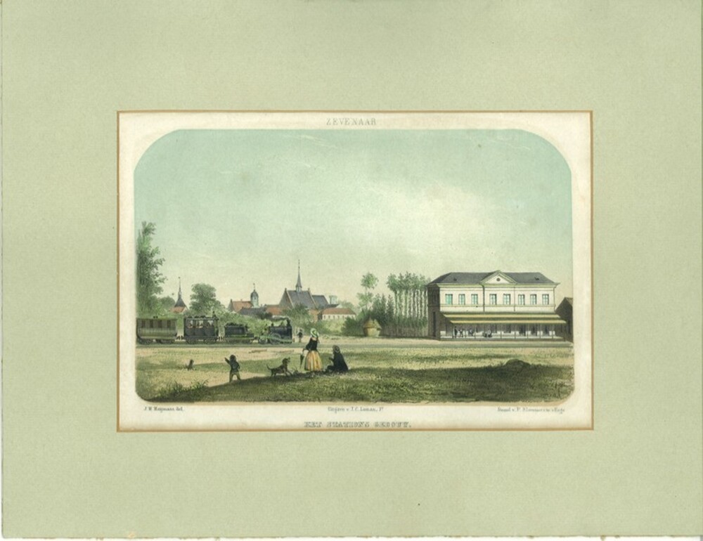 Steendruk met de titel 'Zevenaar Het Stations Gebouw...