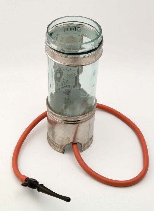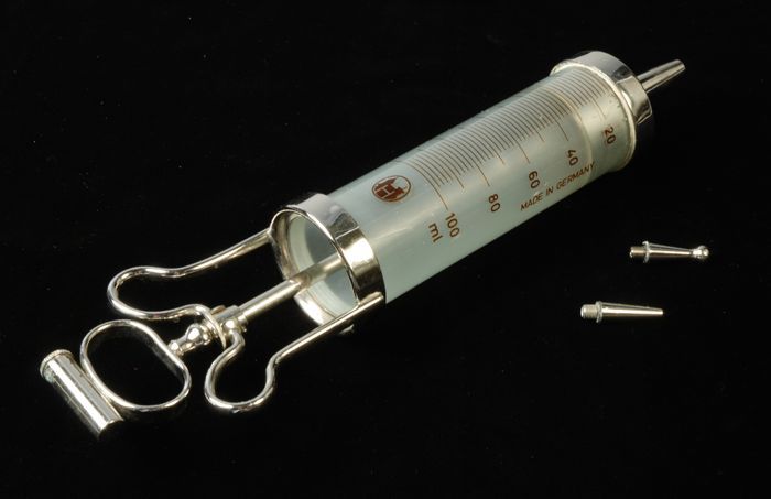 Metalen oorspuit bestaande uit reservoir (A) met maa...