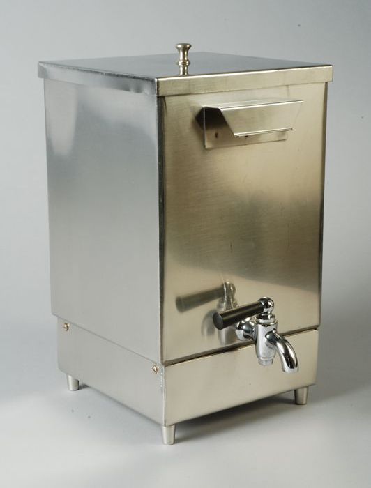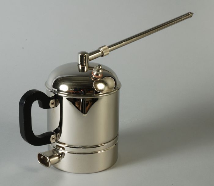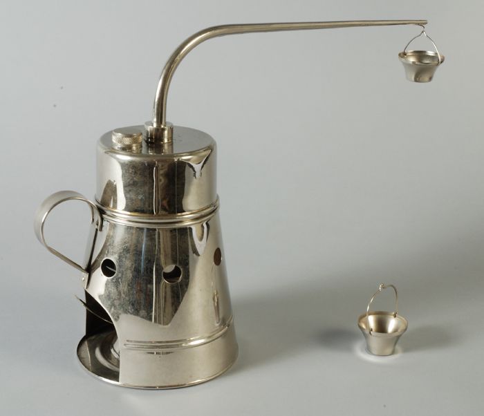 Metalen stoomketel met dop en tuit, spiritusbrander ...