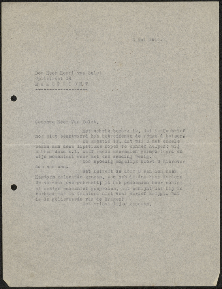 Brief va 2 mei 1944 aan de Heer Henri van Selst Maas...