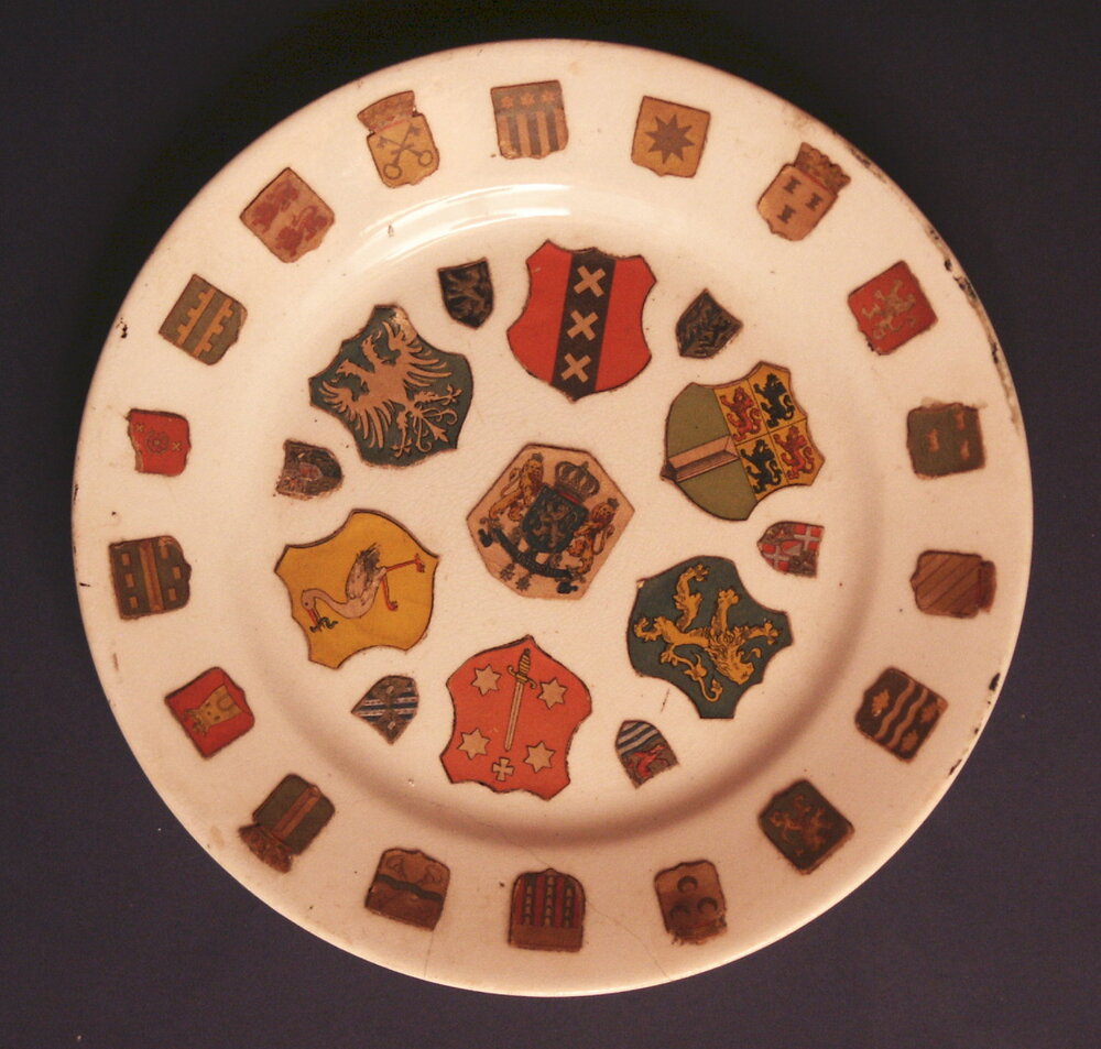 bord gedecoreerd met verschillende wapenschilden van...