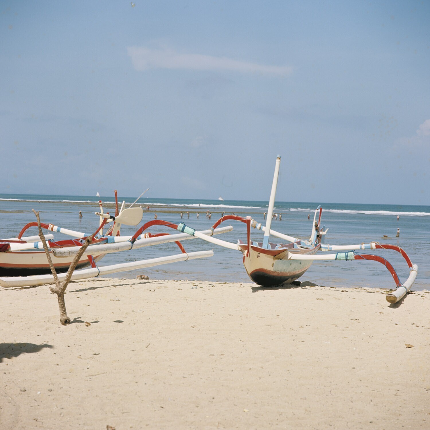 Vlerkprauwen op het strand bij Sanur met Bali Beach ...
