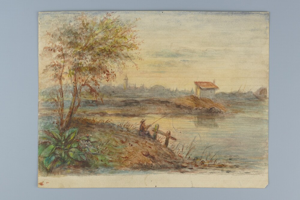 Aquarel voorstellende landschap met visser, ca. 1870.