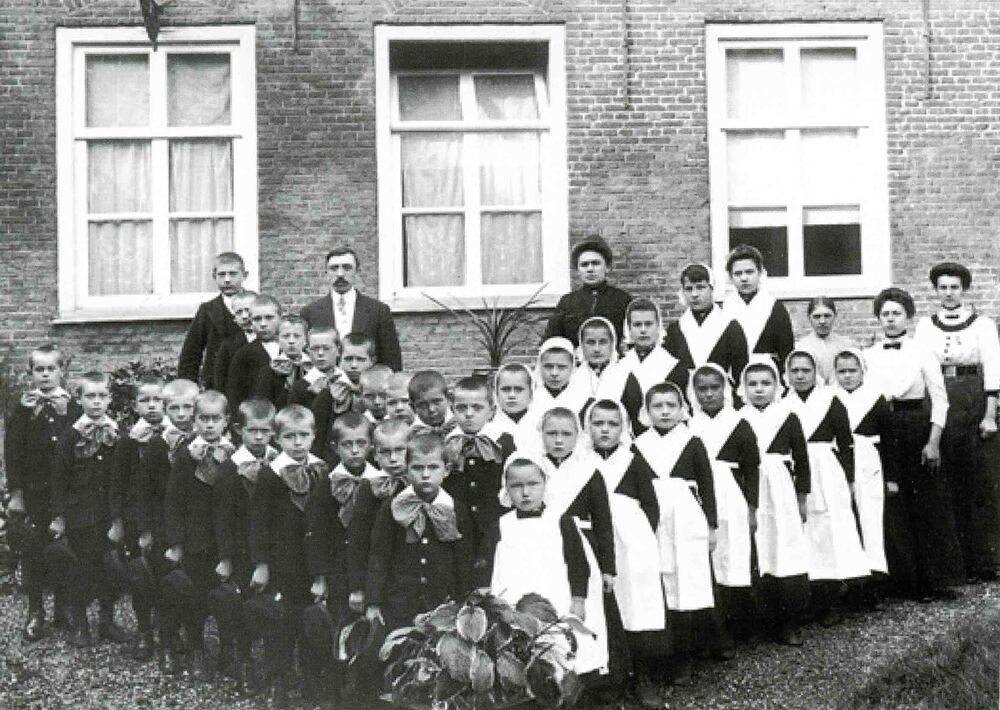 Ansichtkaart, voorstellende een groep weeskinderen v...