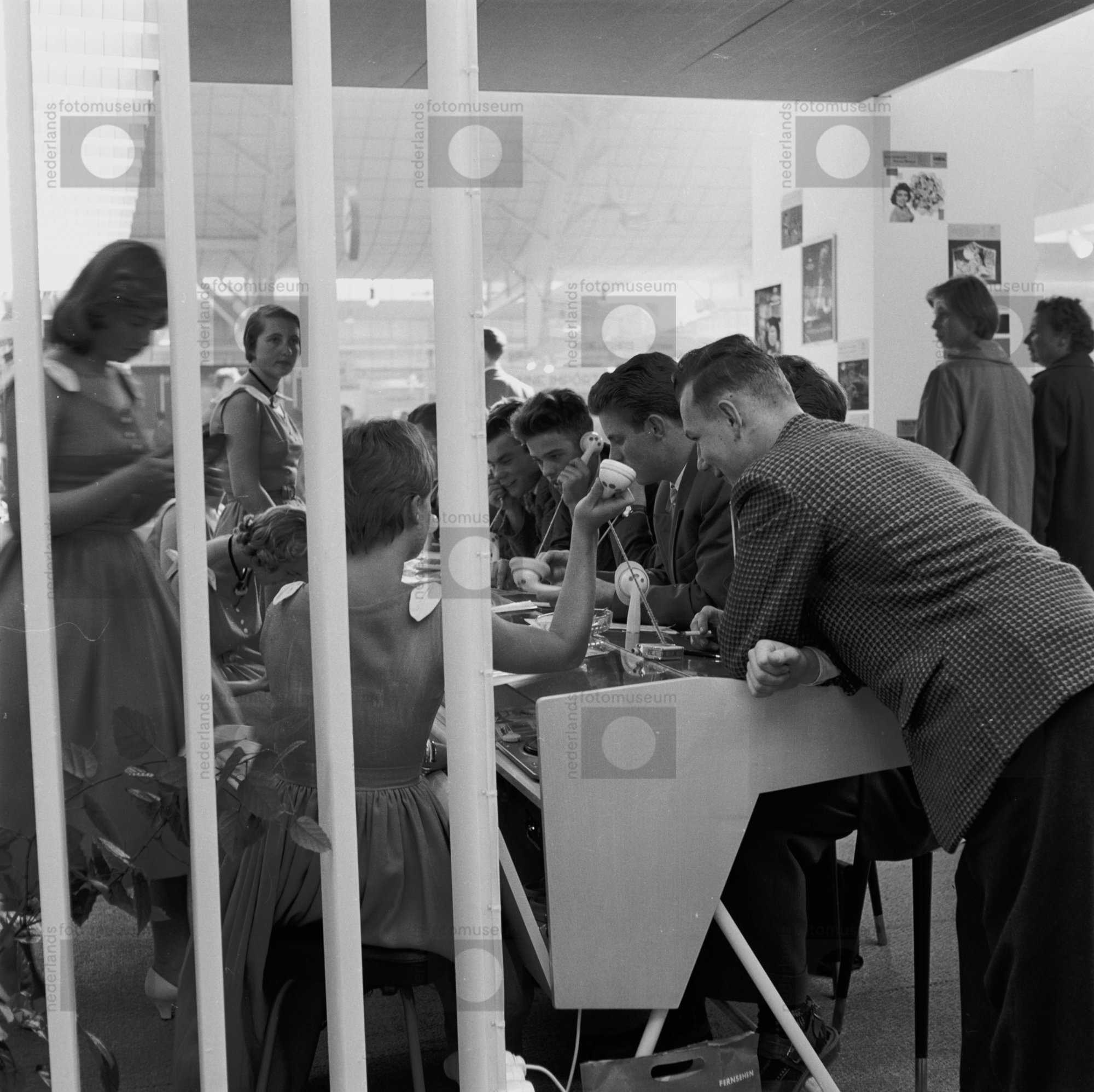 Jongeren beluisteren grammofoonplaten via een telefo...