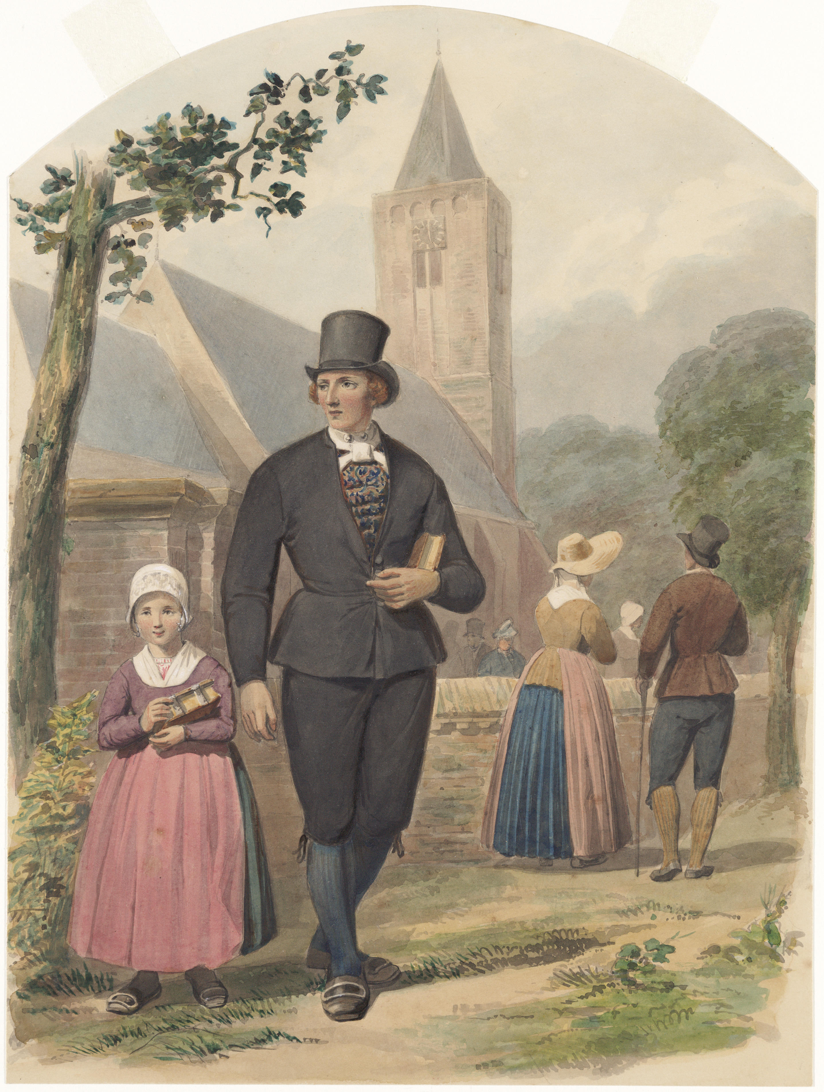 Man en meisje ter kerke in de dracht van Huizen