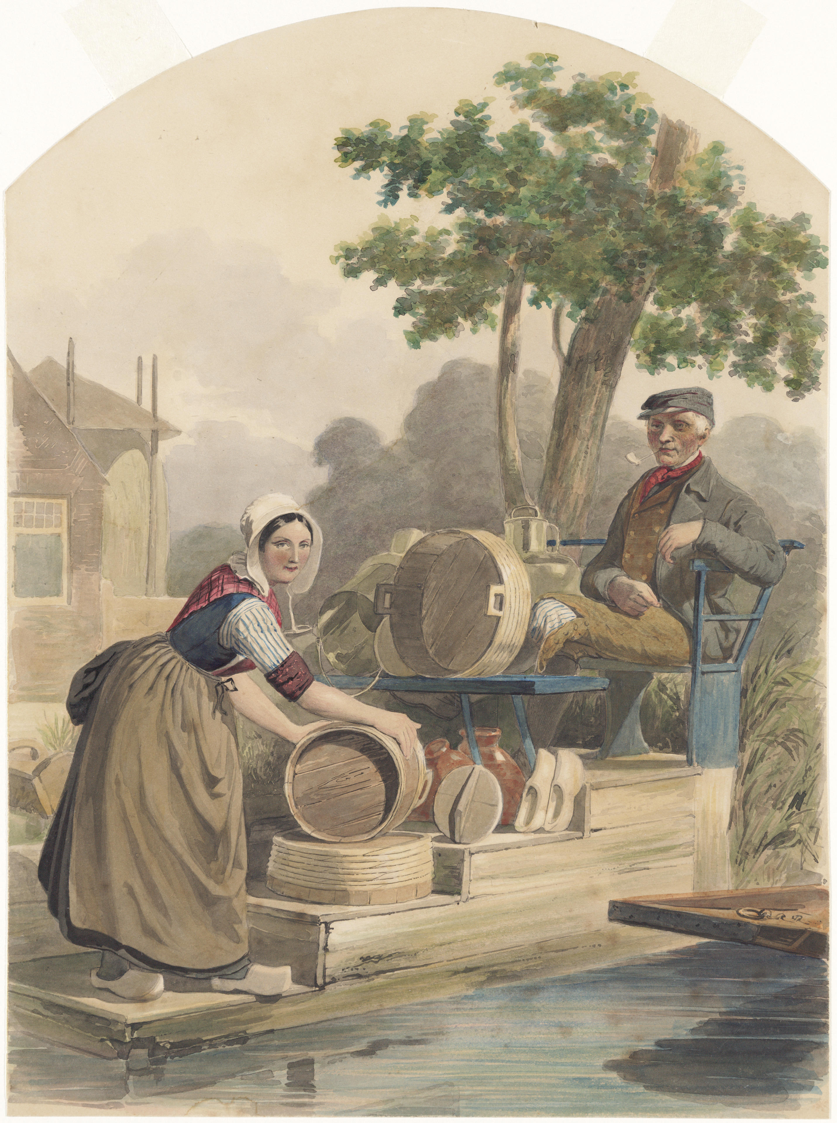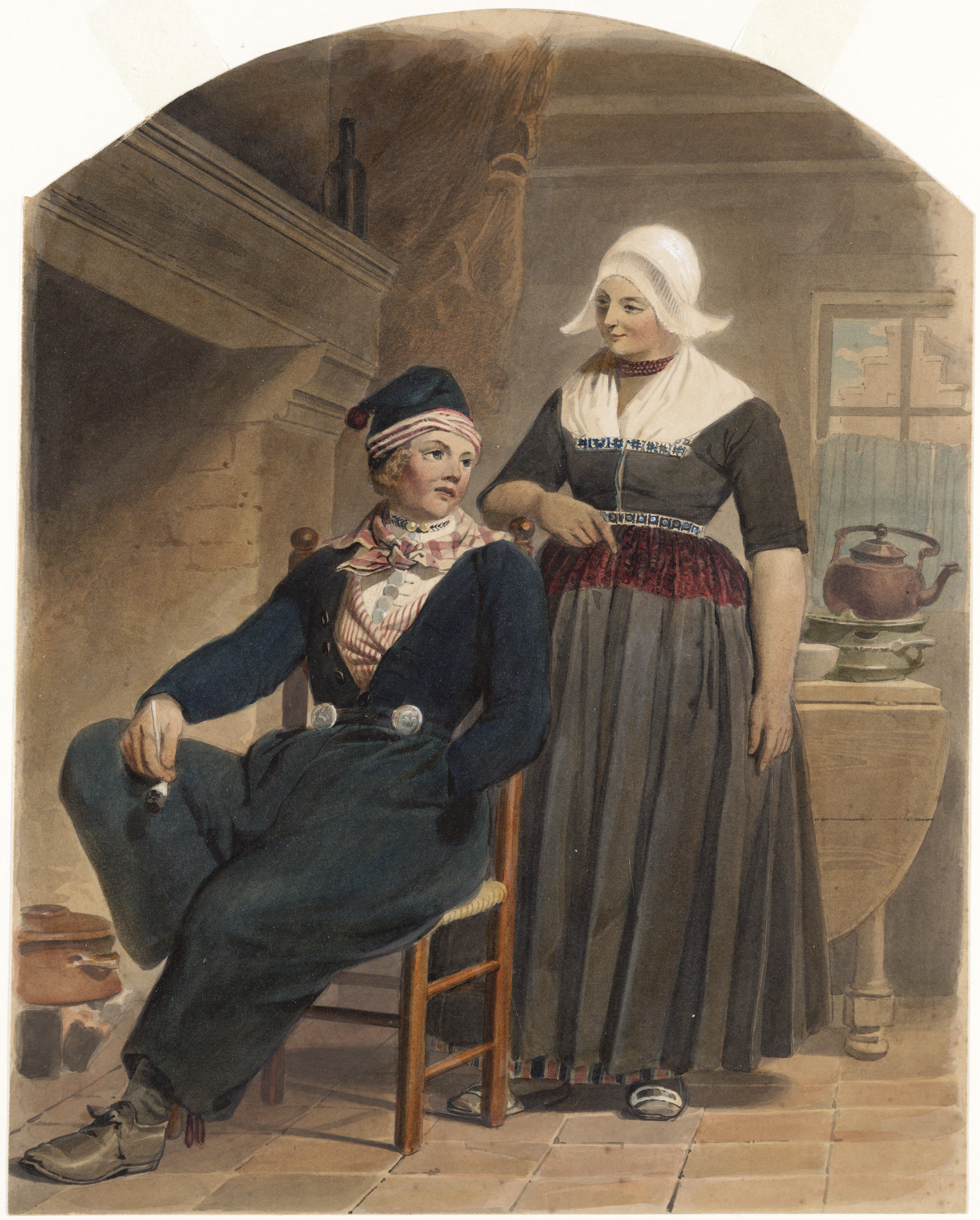 Man en vrouw uit de Alblasserwaard op de boenstoep