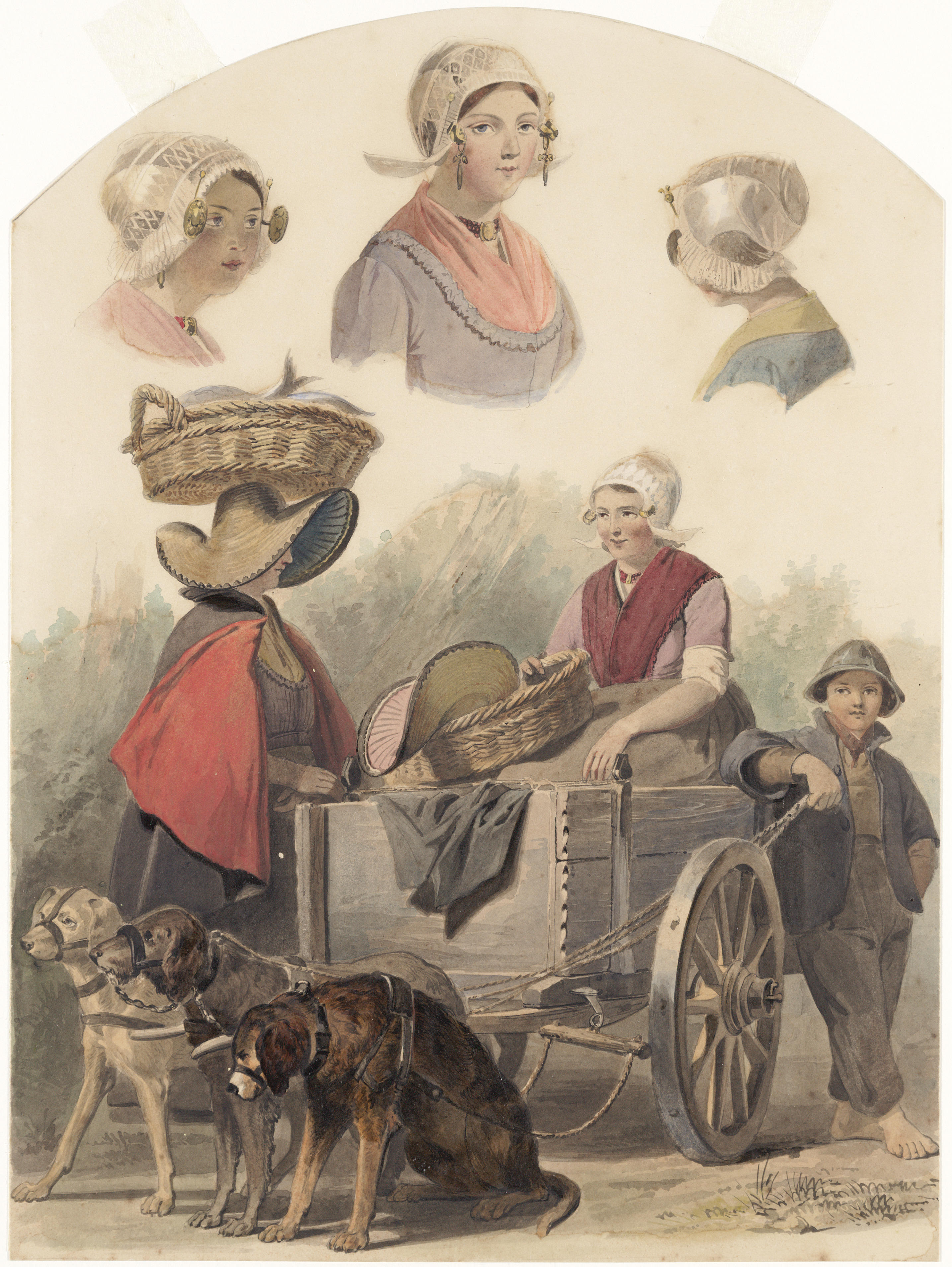 Scheveningse visventsters bij een hondenkar