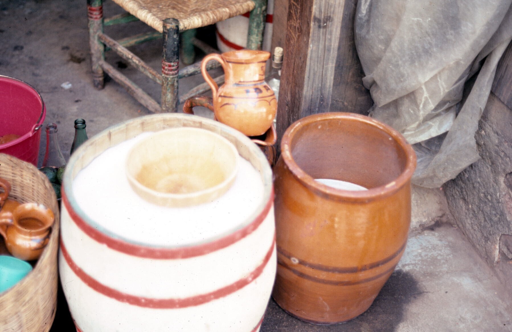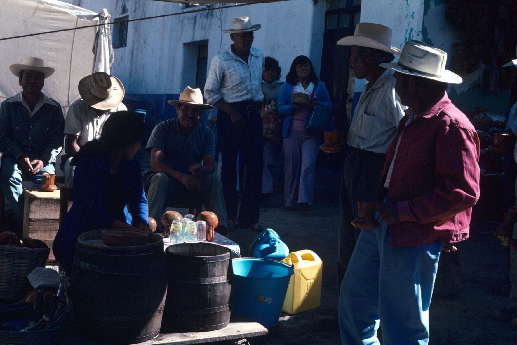 mannen bij pulquestalletje; NB pulquemokken uit Teco...